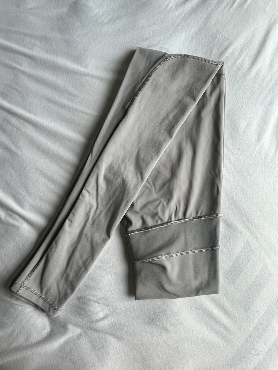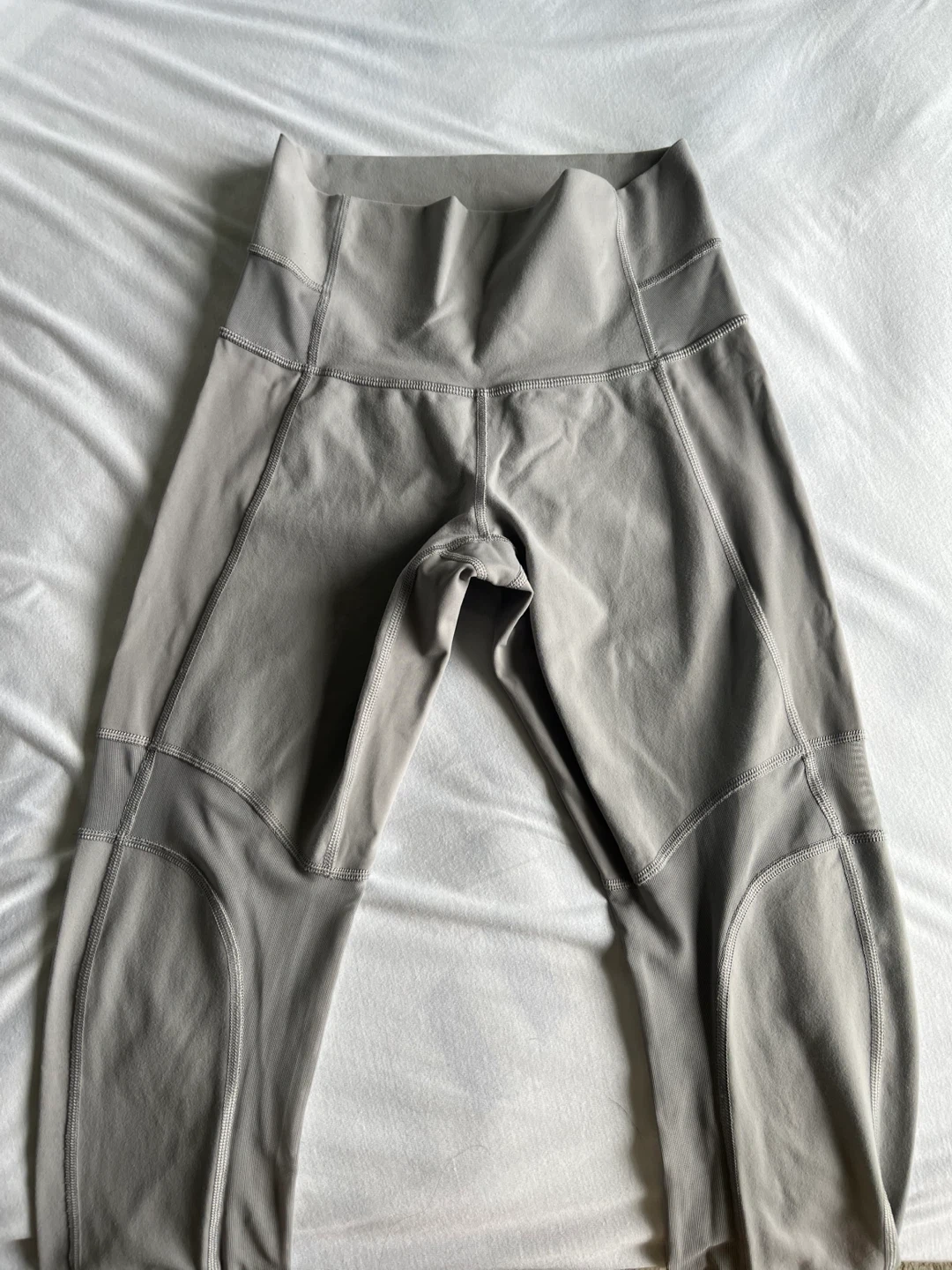 Selling a pair of Lululemon leggings in a neutral gray color. Mesh design on the legs and waist. Size 6 (no tags) and full length. They're in great condition and ready for a new home! Perfect for workouts or just lounging around