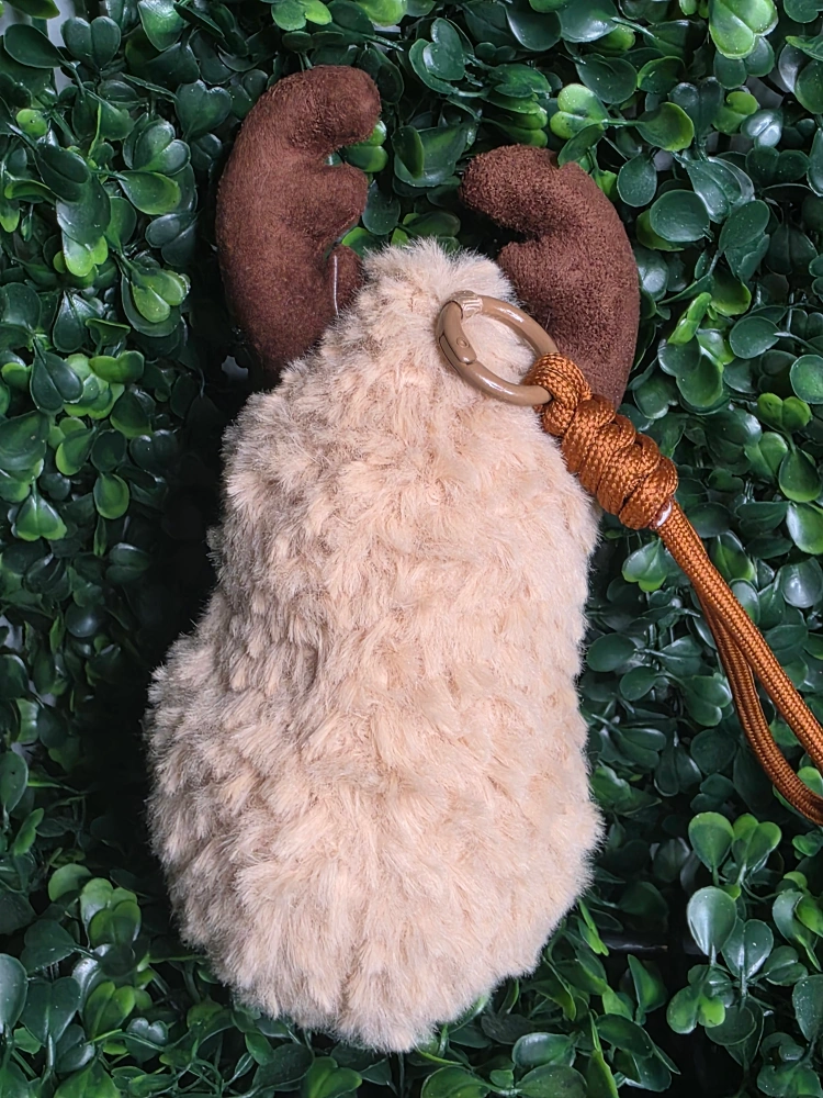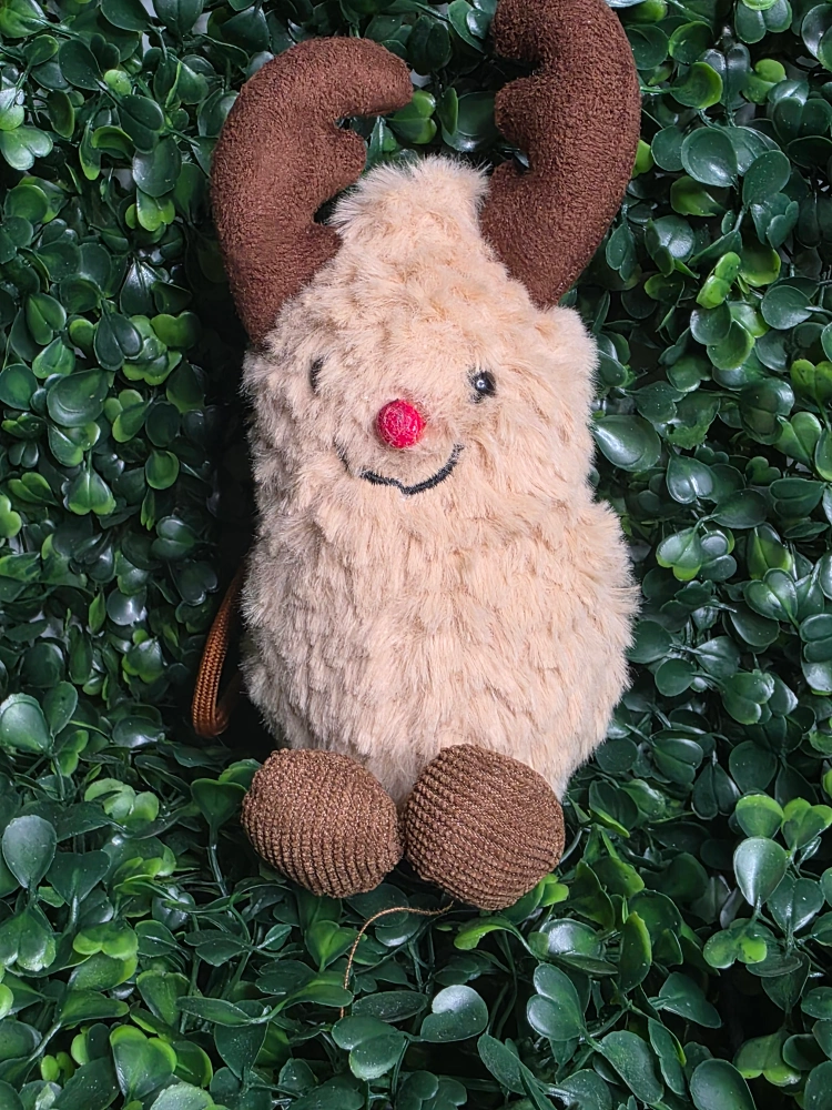 Here's a cute reindeer plushie! It's a soft, cuddly toy with brown antlers and a red nose. Perfect for the holidays or as a year-round friend
