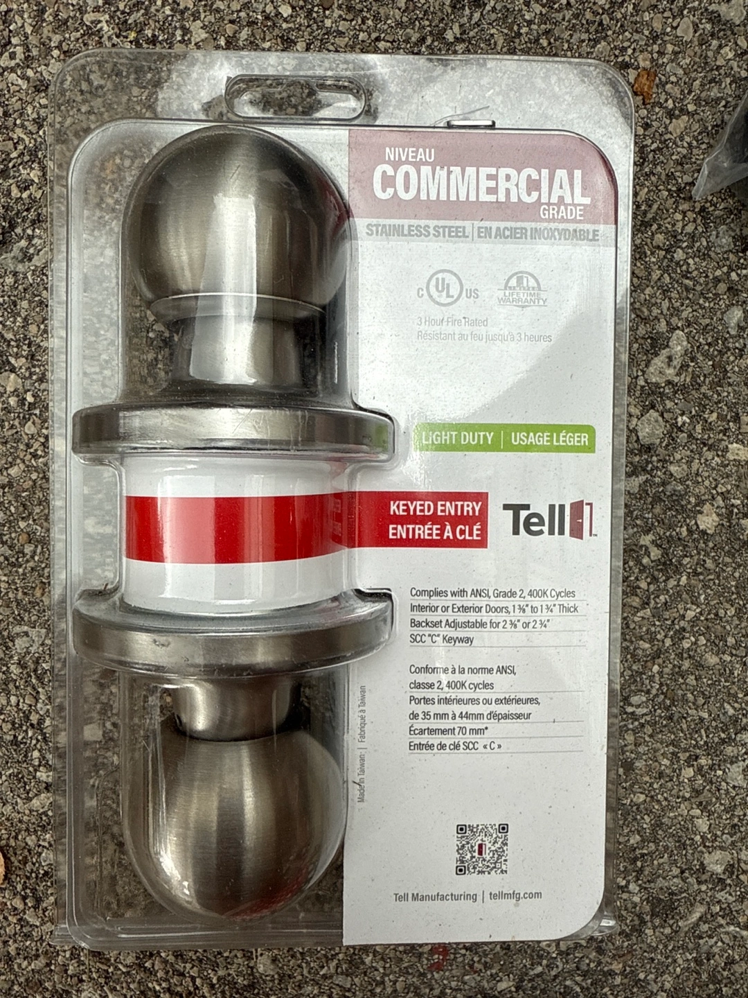 Selling a new Tell keyed entry door knob! It's a commercial grade, light duty knob made of stainless steel. It's fire rated for 3 hours and complies with ANSI Grade 2, 400K cycles. It's suitable for interior or exterior doors, 1 3/8" to 1 3/4" thick. The backset is adjustable for 2 3/8" or 2 3/4". SCC "C" Keyway. Box included!