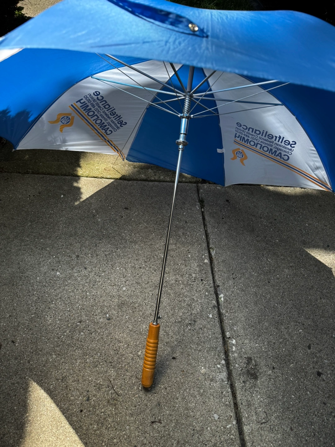 Giving away a blue and white umbrella with the Selfreliance Federal Credit Union logo with wooden handle. It's in good shape and ready to keep you dry on a rainy day!