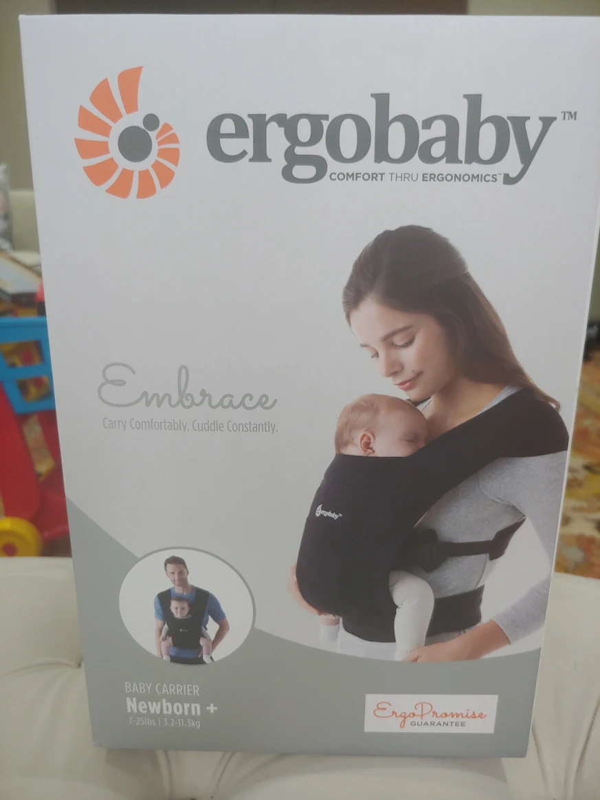 Like New Ergobaby Embrace baby carrier in black. It's designed for newborns and babies from 7-25lbs (3.2-11.3kg). Comes with the original box and instruction manual. Tried on with baby only.