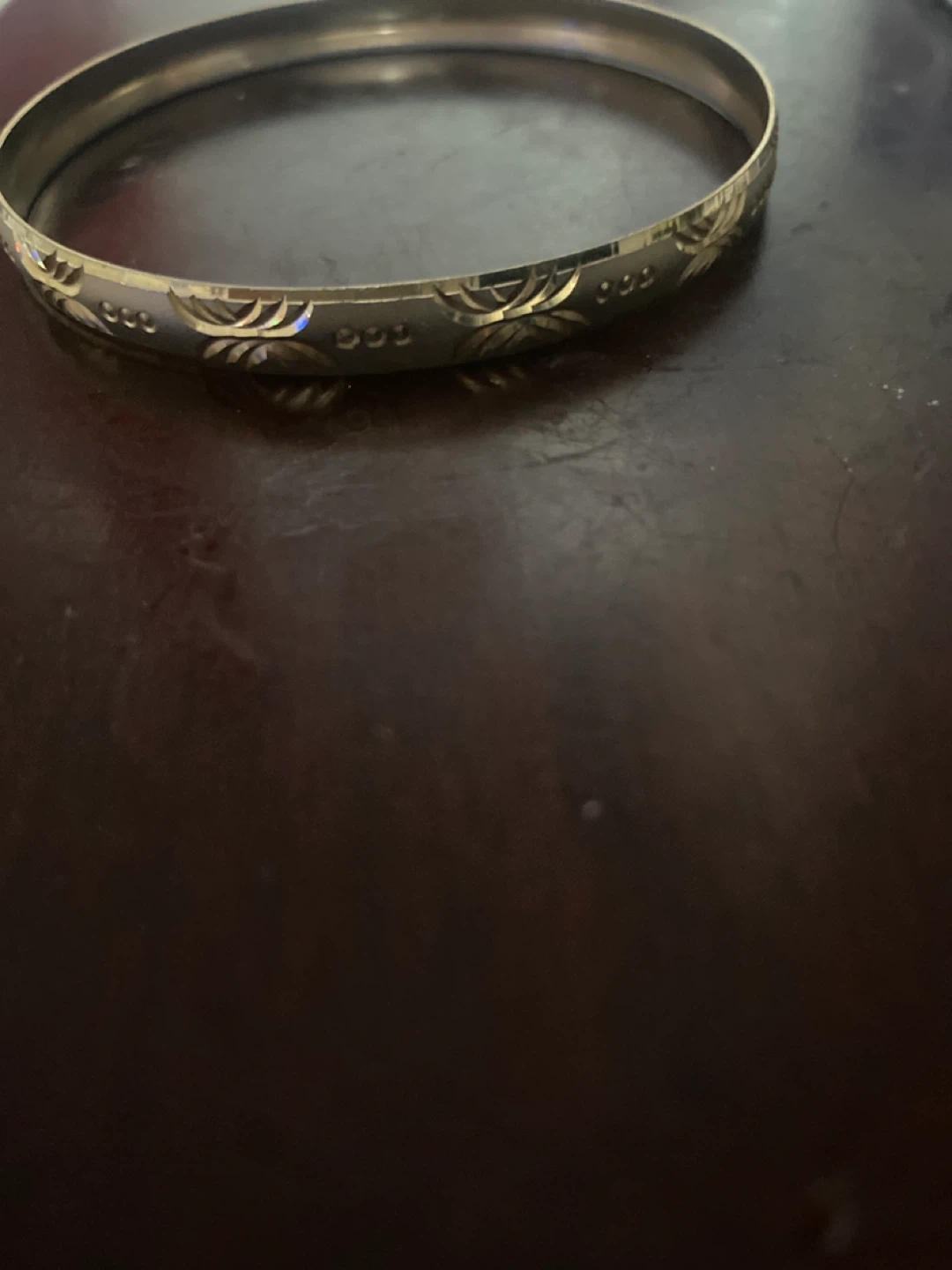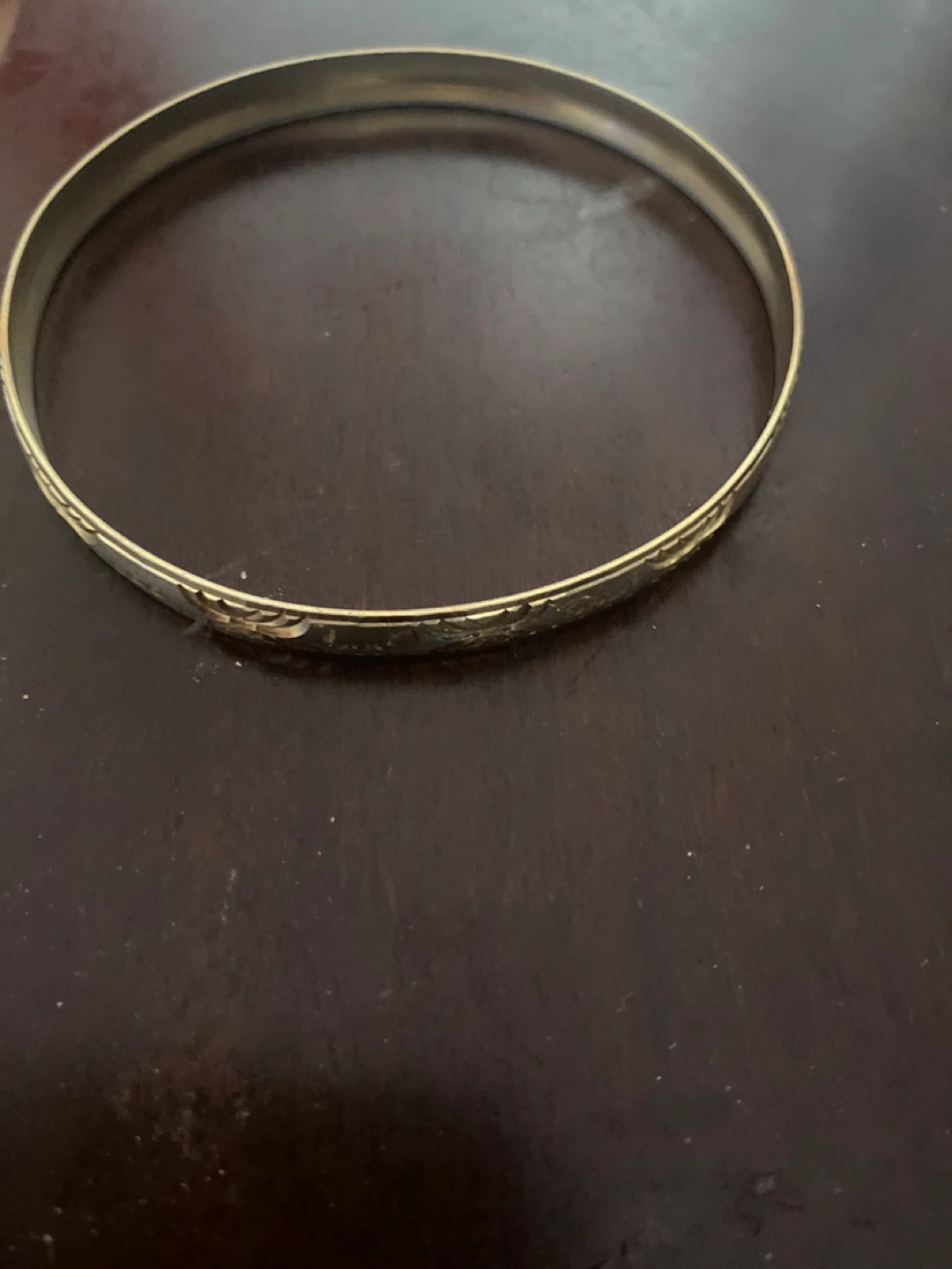 Here I have gold tone bangle bracelet. The bracelet has a floral pattern on it. It's in great condition and ready for a new owner!