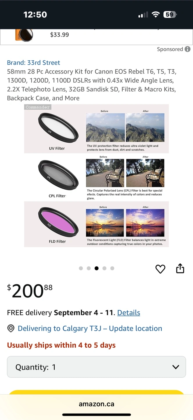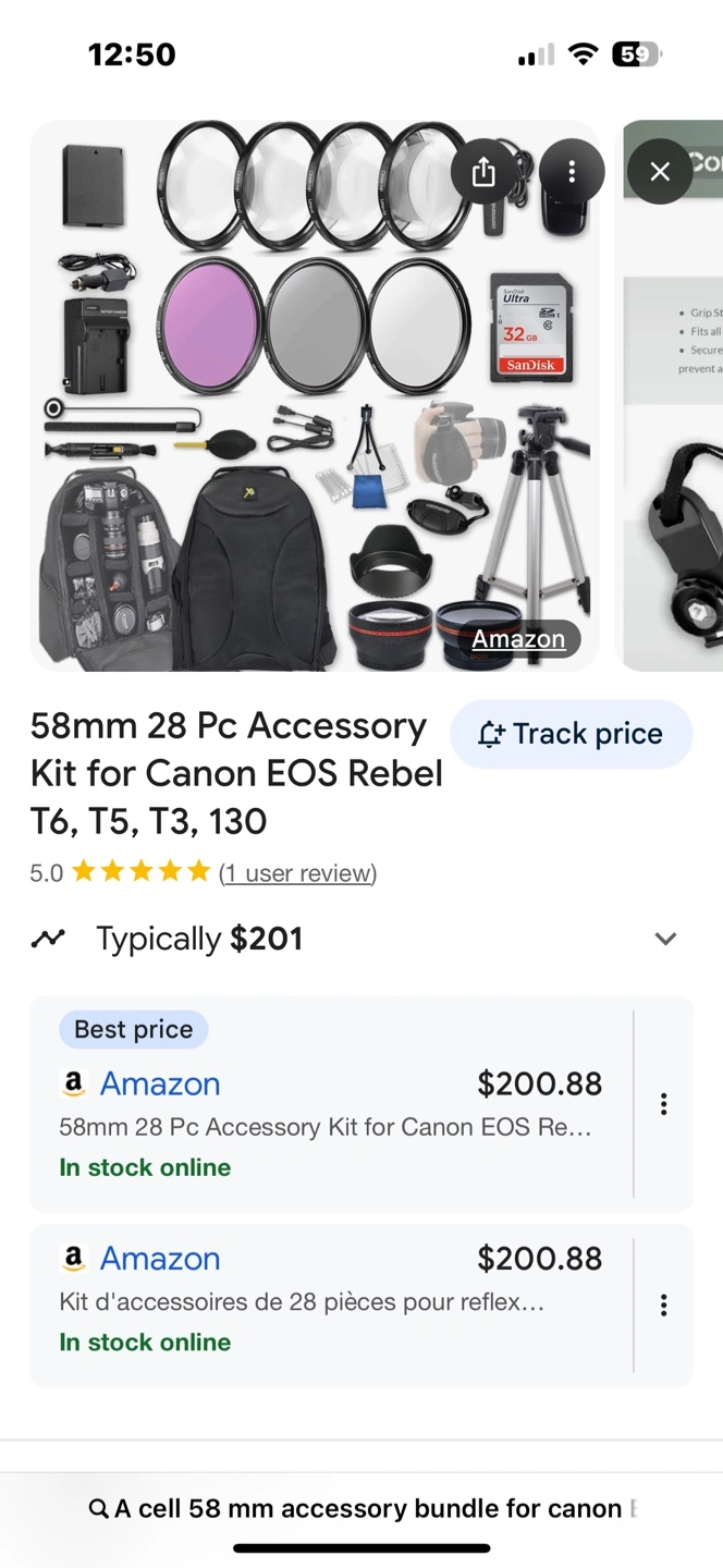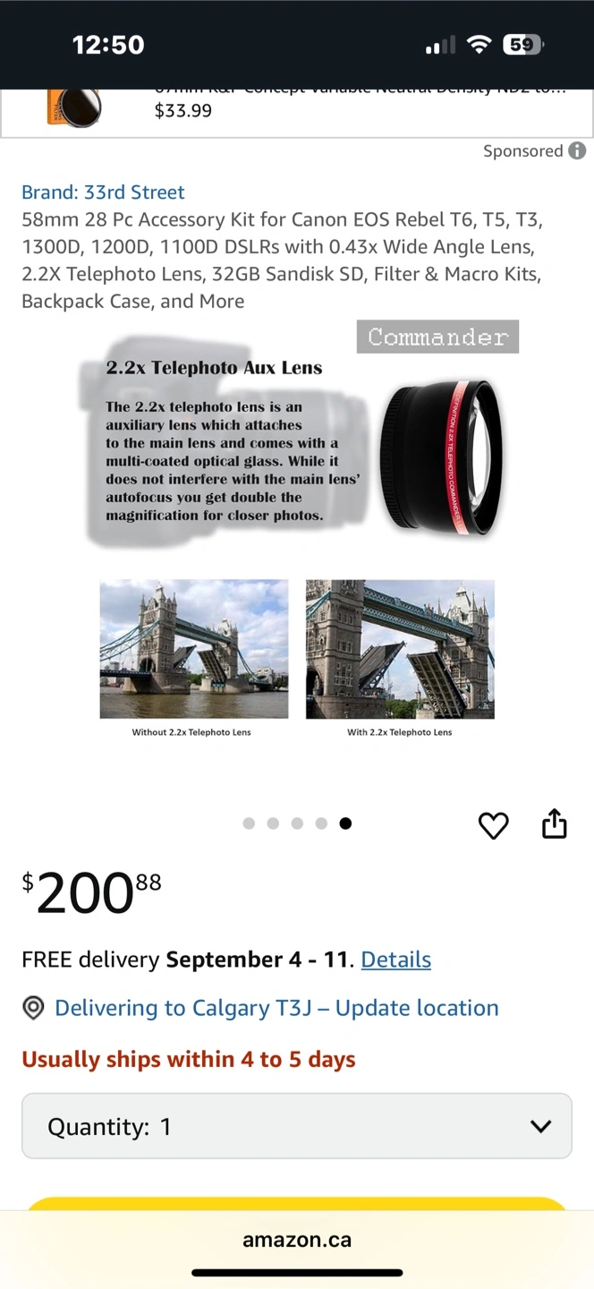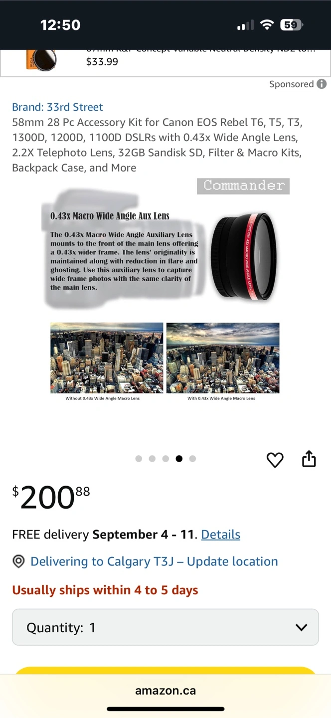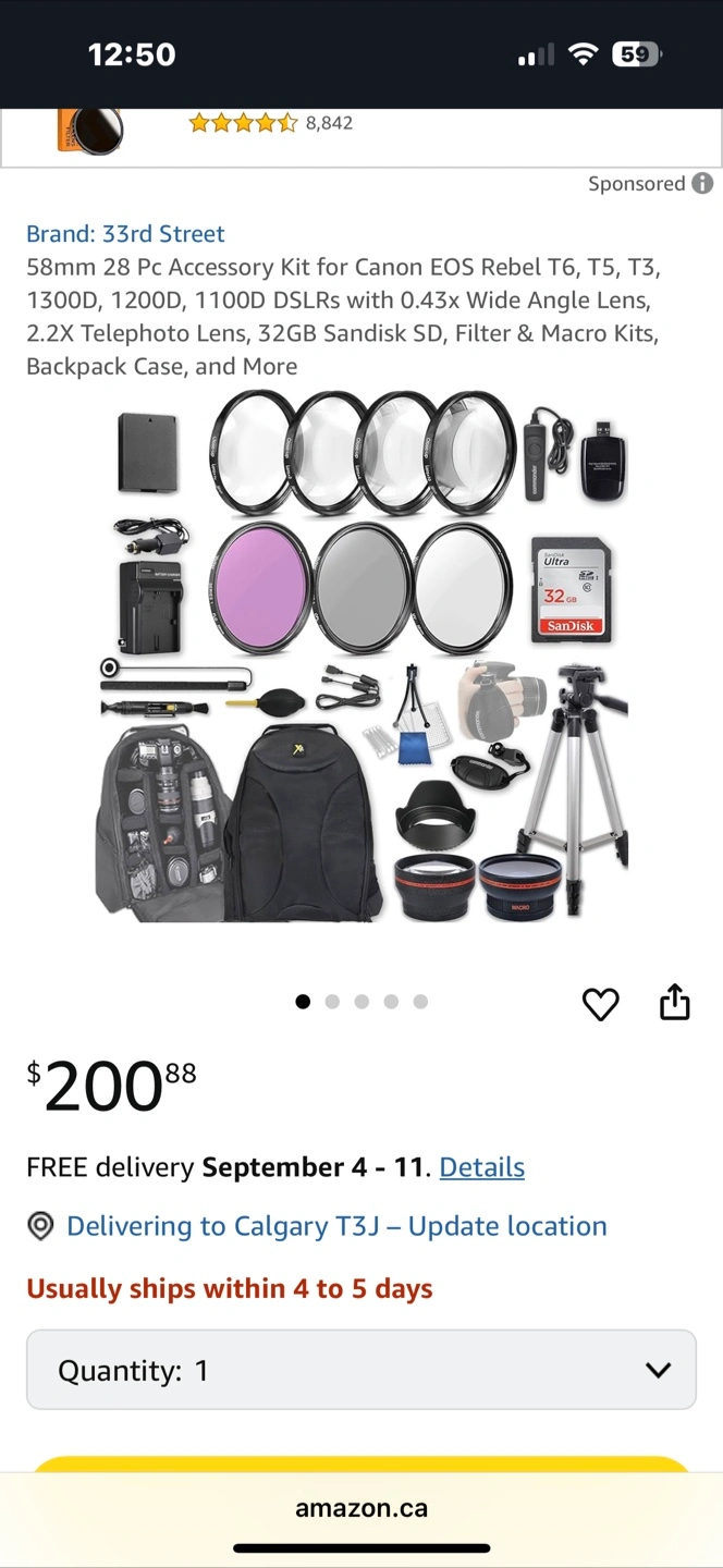 Selling a 33rd Street 58mm 28-piece accessory kit for Canon EOS Rebel cameras! This kit is compatible with T6, T5, T3, 1300D, 1200D, and 1100D DSLRs. It includes wide angle and telephoto lenses, a 32GB SD card, filters, a macro kit, and a backpack case. A great way to expand your photography options!
