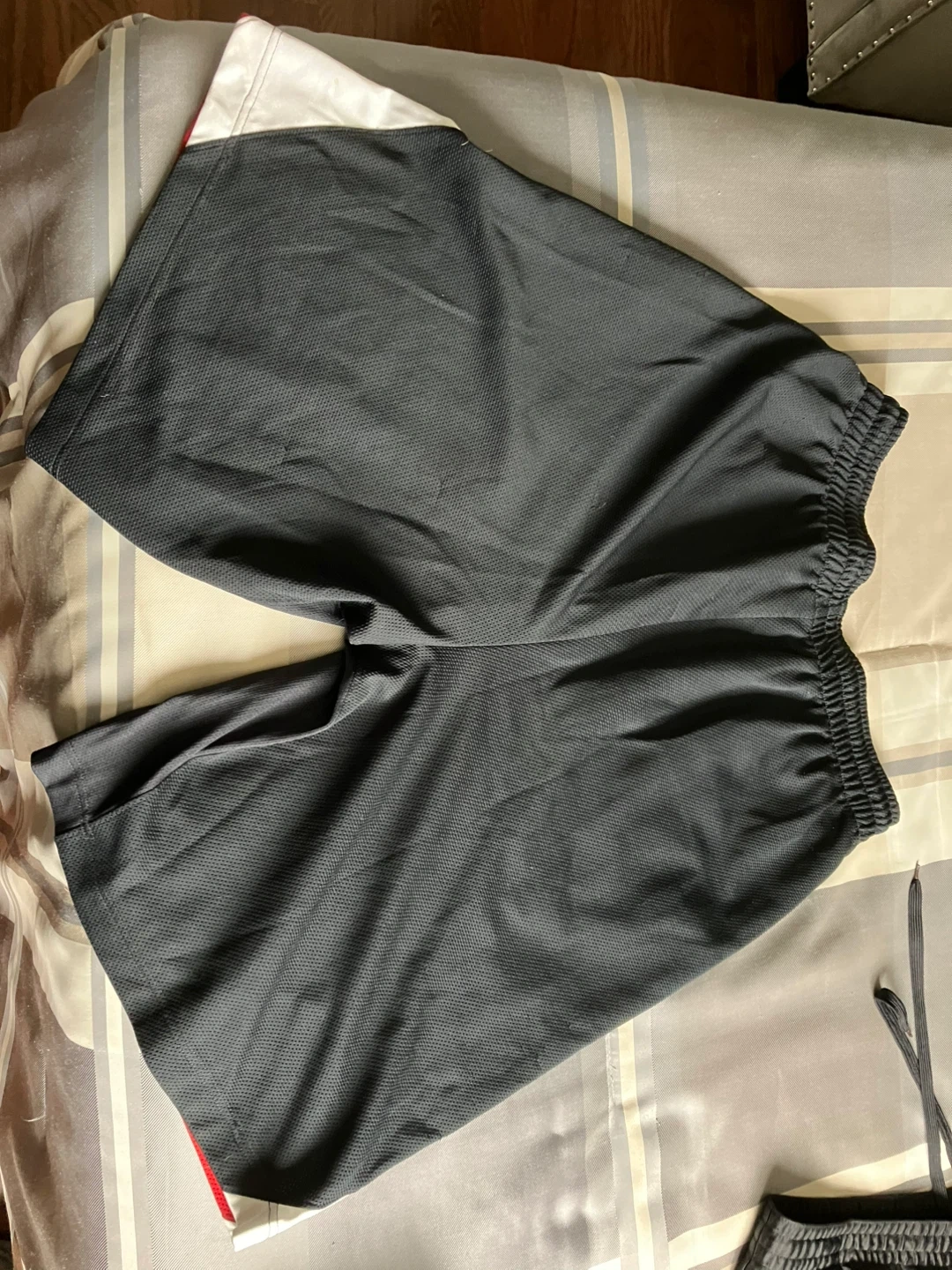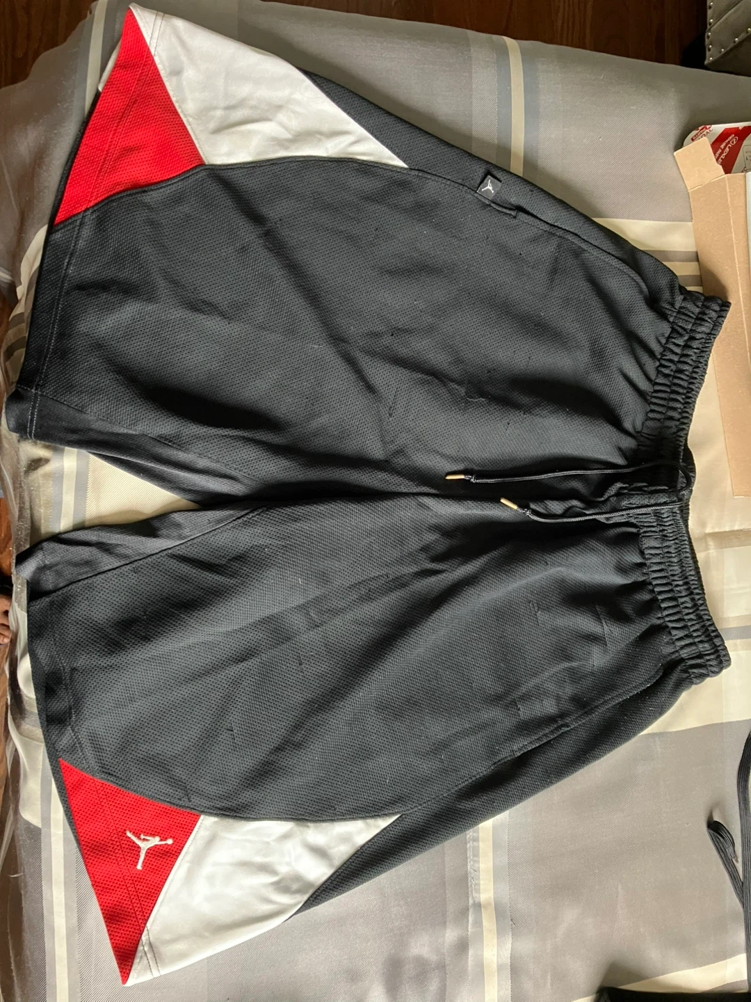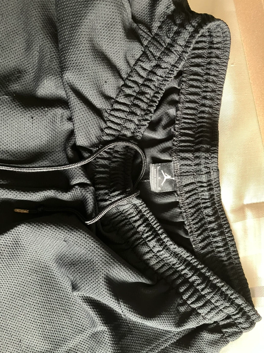 Men’s pair of black Jordan shorts for sale. The size is large and the material is 100% polyester. The length of the inseam (from the private area to the hem or bottom of the shorts) is 11 inches, the length from the waist to the private area is 14 inches and the length of the waist when the shorts are relaxed or not being worn is 32 inches. These shorts are very roomy and provide lots of room for the hips and thighs to breathe