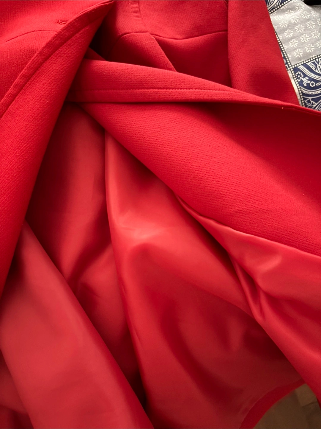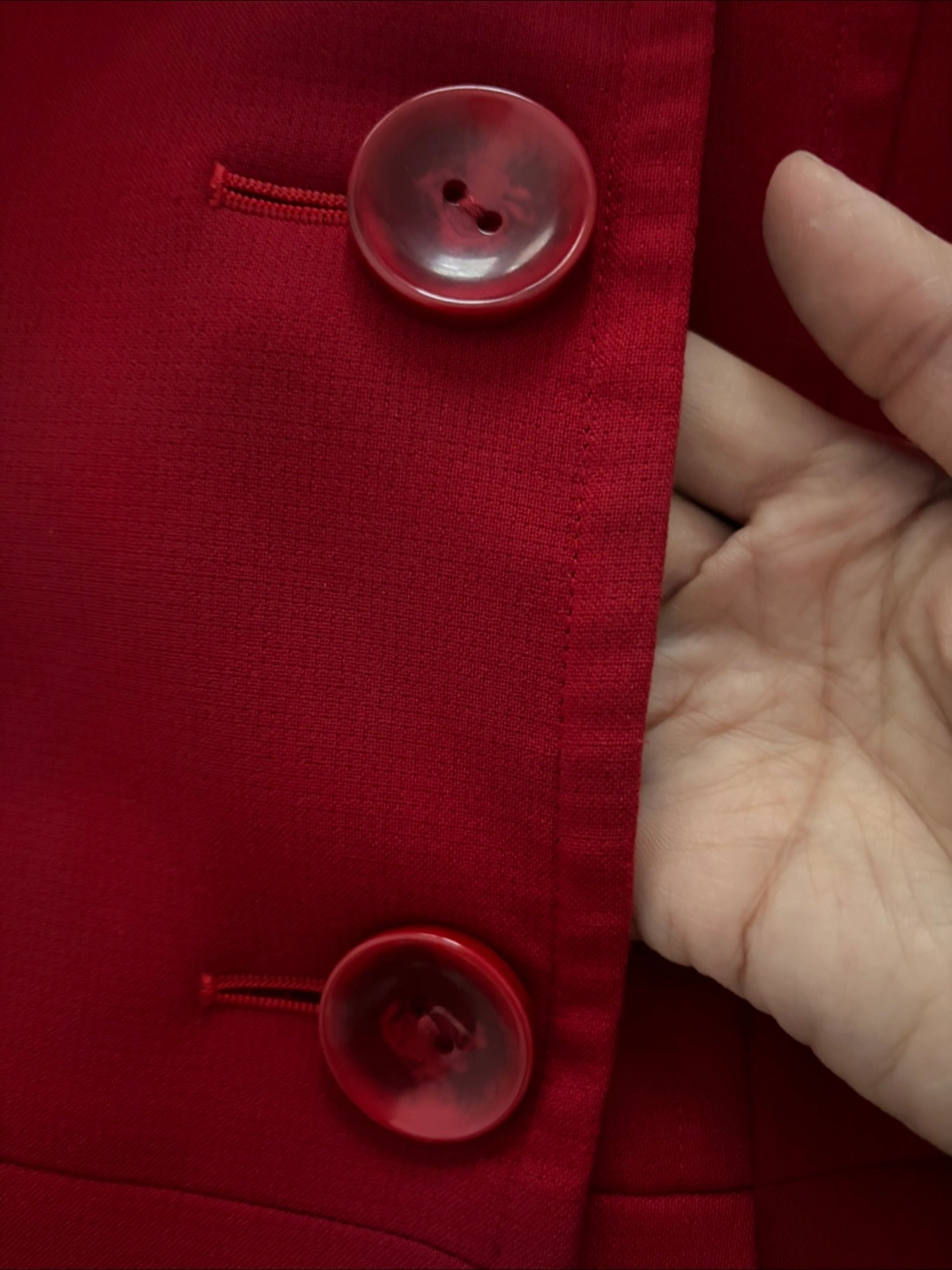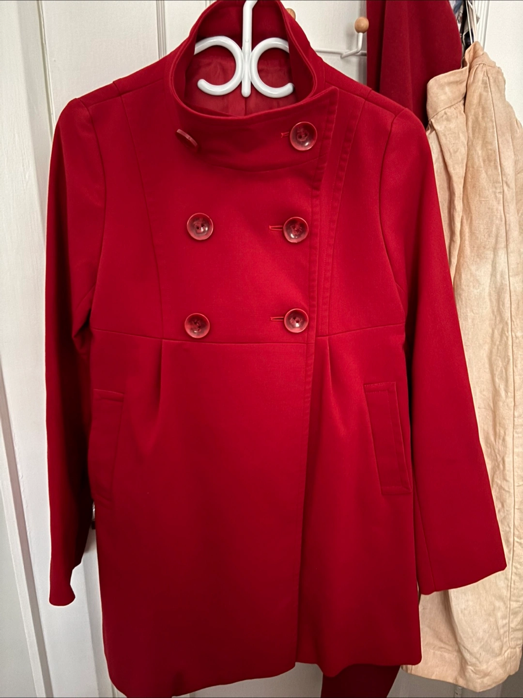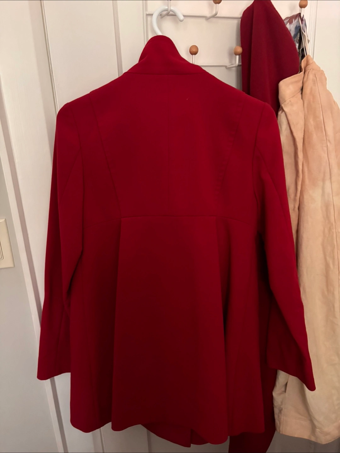 Here's a lovely red coat with a button-down style! It’s a A-line blazer in great condition and very good quality. The colour is a beautiful, vibrant red. Original price was over $160