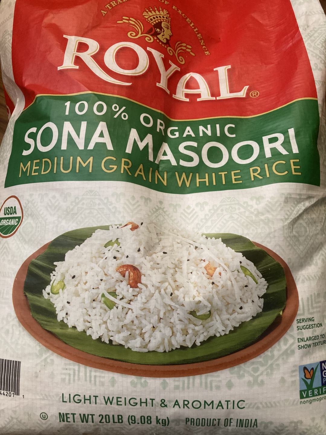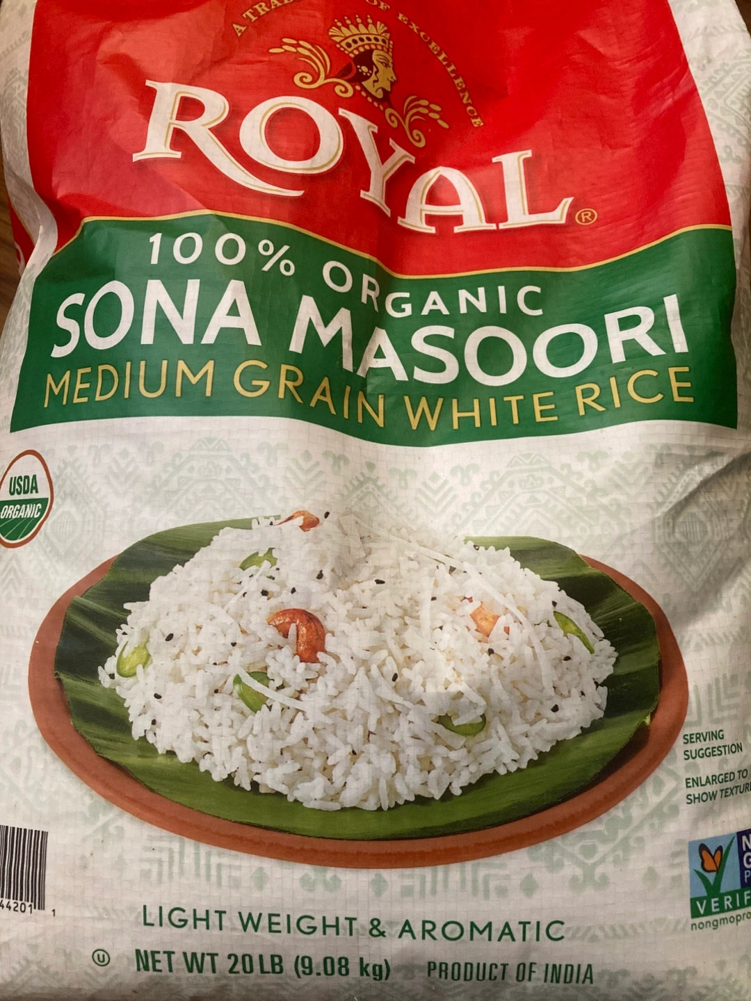 20lb bag of Royal 100% Organic Sona Masoori Medium Grain White Rice. It's lightweight and aromatic, perfect for your next meal!