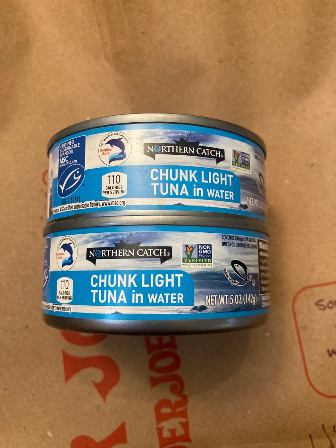 2 cans of Northern Catch Chunk Light Tuna in Water! Each can is 5 oz (142g) and contains 110 calories per serving.