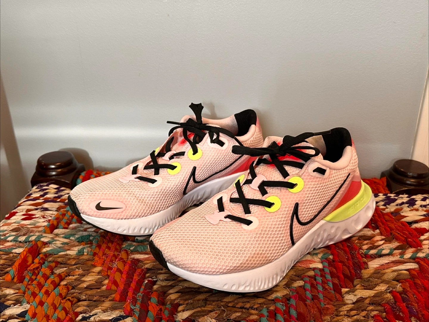 Selling a pair of Nike Renew Run 3 women's running shoes. They have some wear on the soles, but the uppers are still in great shape. Perfect for jogging or everyday wear!