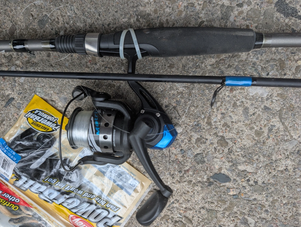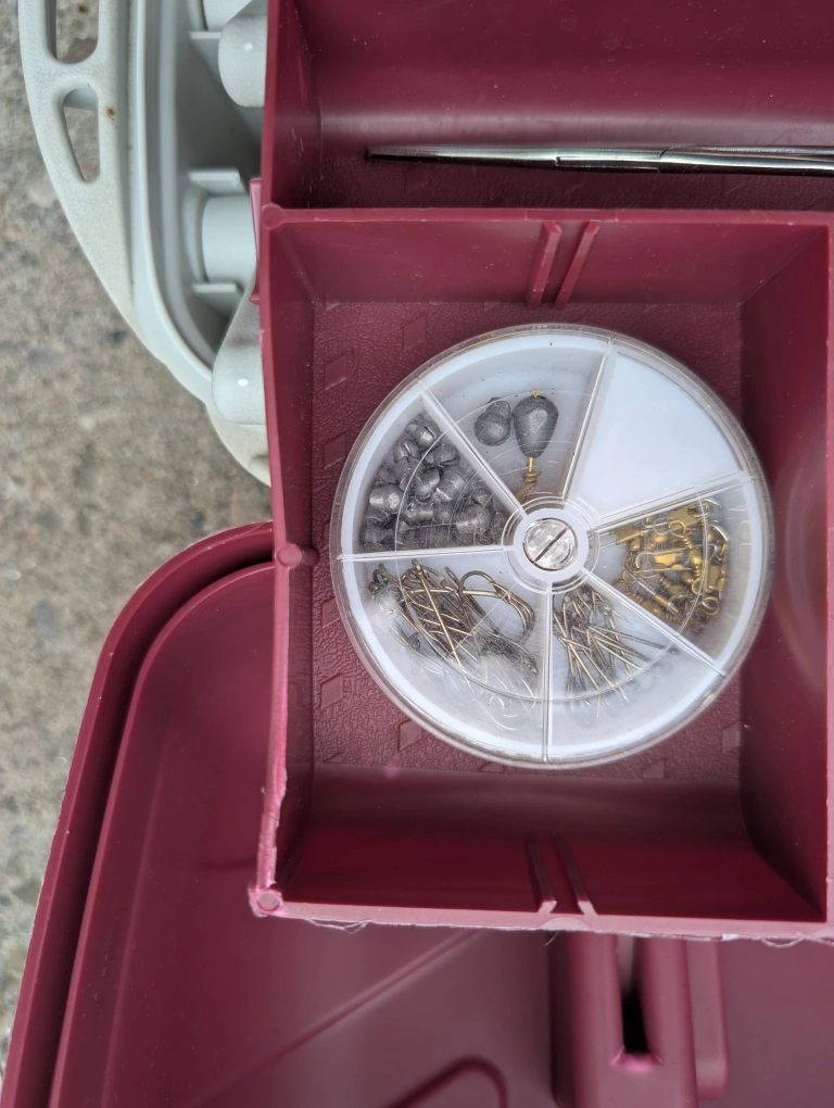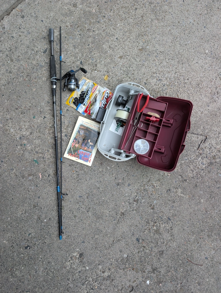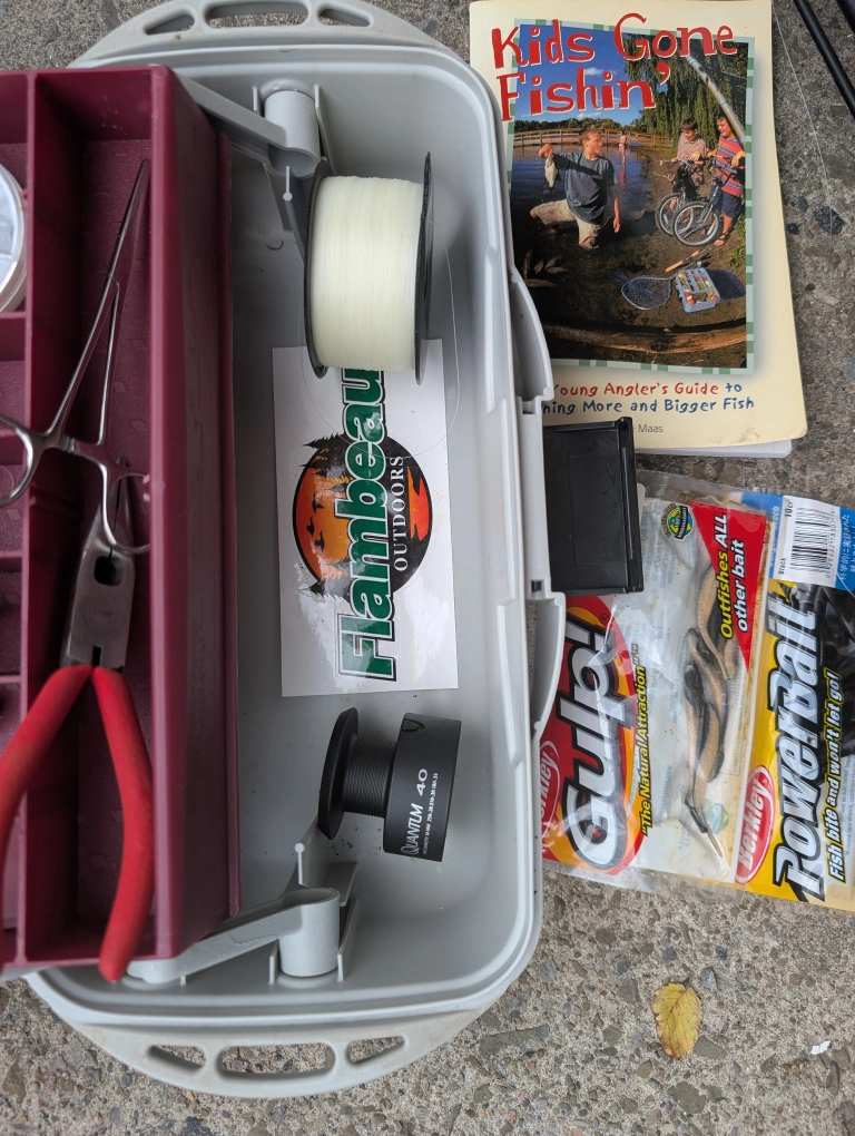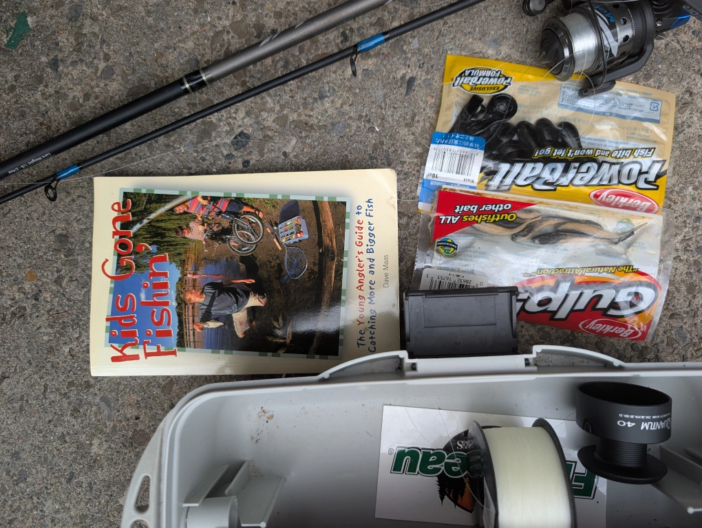 I'm selling a fishing rod with a reel, a tackle box, and various fishing accessories. The tackle box includes hooks, weights, line, and other essential items. Also included is a book called "Kids Gone Fishing" and a bag of Berkley PowerBait.