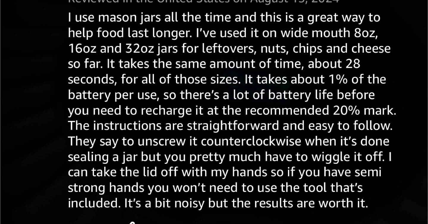 This automatic mason jar vacuum sealer is a great way to help food last longer! It works on wide mouth 8oz, 16oz, and 32oz jars for leftovers, nuts, chips, and cheese. It takes about 28 seconds for all of those sizes and uses about 1% of the battery per use. The instructions are straightforward and easy to follow!