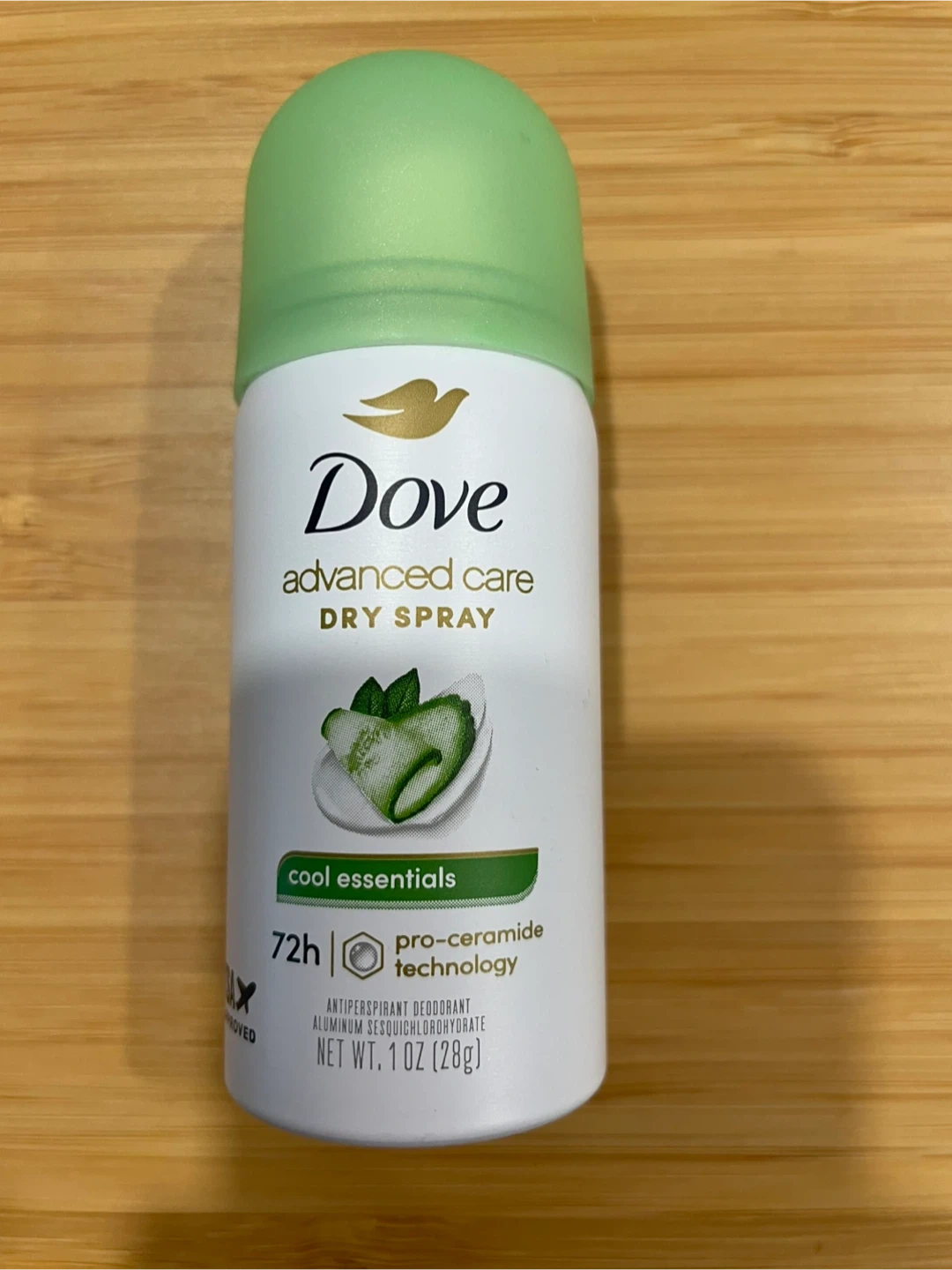Selling a Dove Advanced Care Cool Essentials Dry Spray. It features pro-ceramide technology and provides 72 hours of protection. The net weight is 1 oz (28g). Expiration date is June 2027