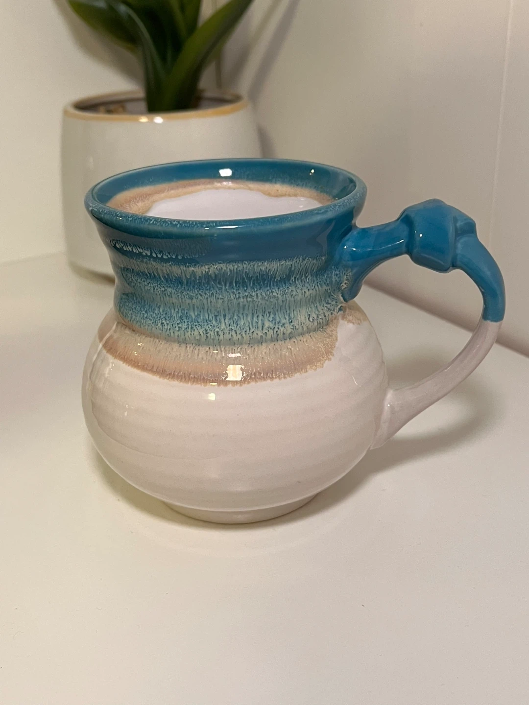 Selling a lovely handmade ceramic mug. It features a beautiful blend of blue and white colours. Perfect for your morning coffee or tea!