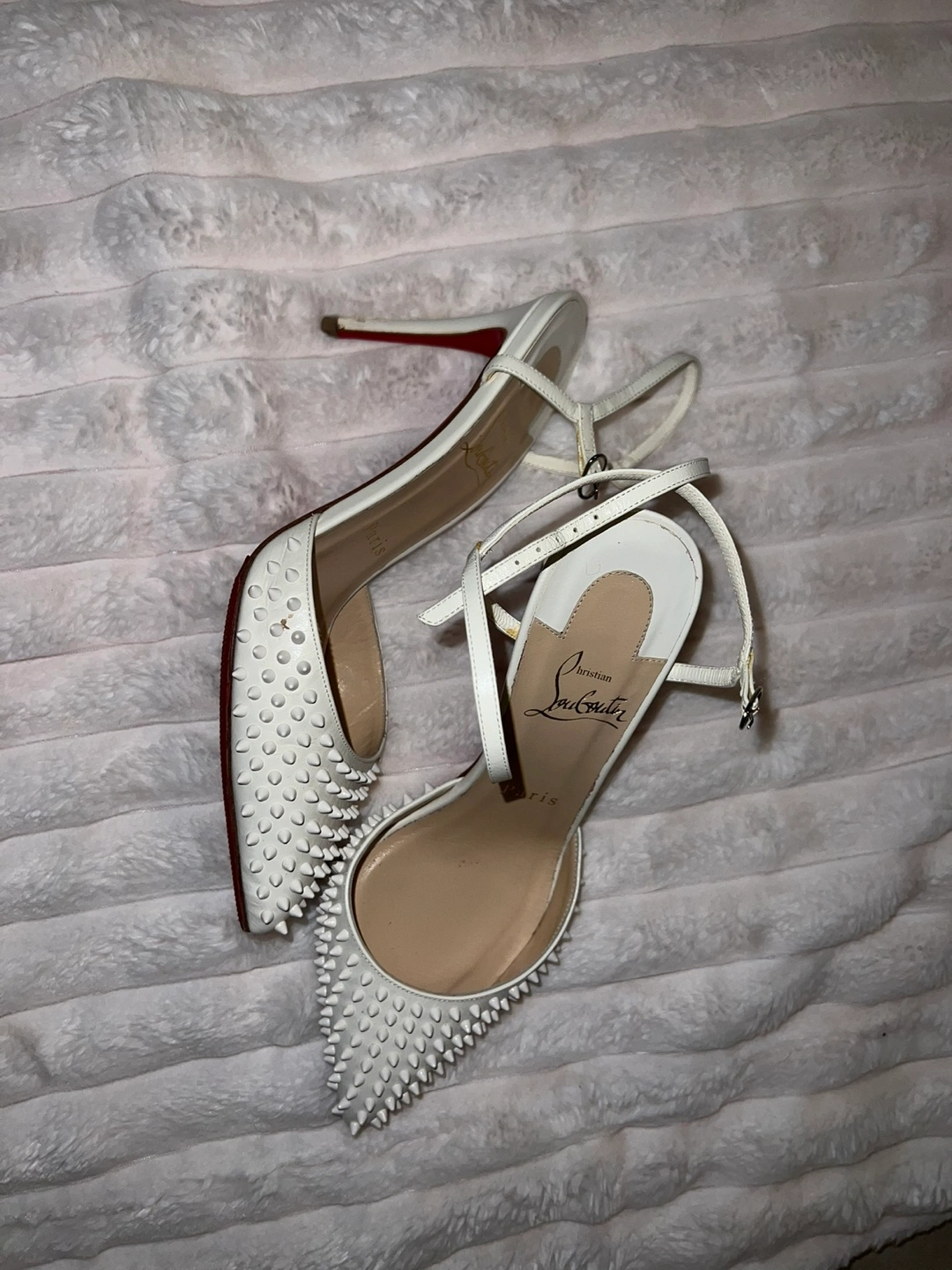 These are a pair of Christian Louboutin heels in white with a spike design. They feature the iconic red soles. They are in great condition!