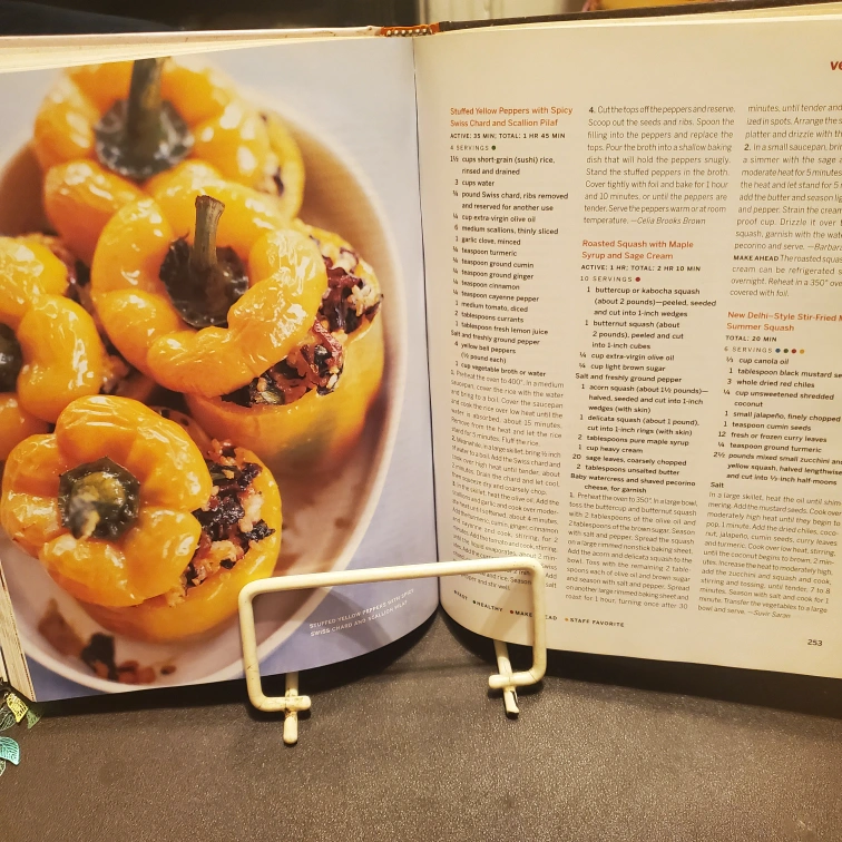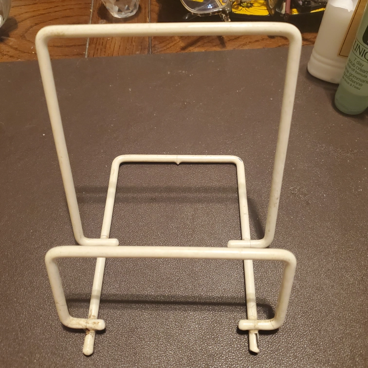 Giving a simple white metal cookbook stand. It's perfect for propping up your favorite recipes while you cook. Shows some wear but still very useful.