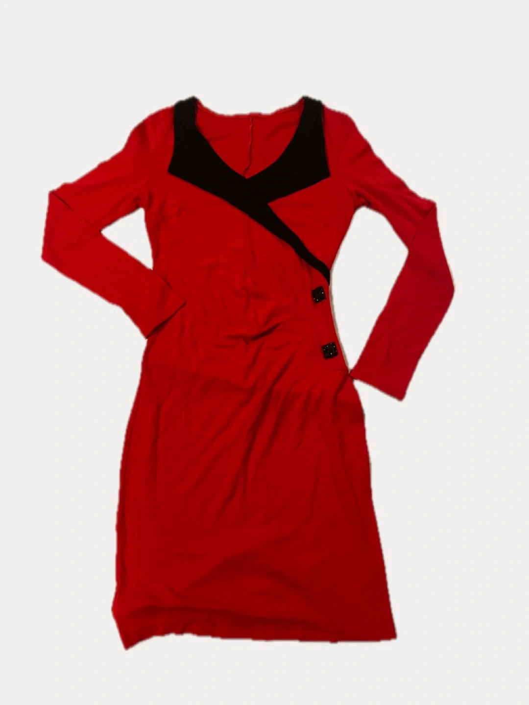A striking red cocktail dress with black accents. It looks great for a night out or a special occasion. It has pleated detail at waistline to accentuate the curves! It’s also hot great stretch! In excellent vintage condition and ready for a new home! Fits a S/M