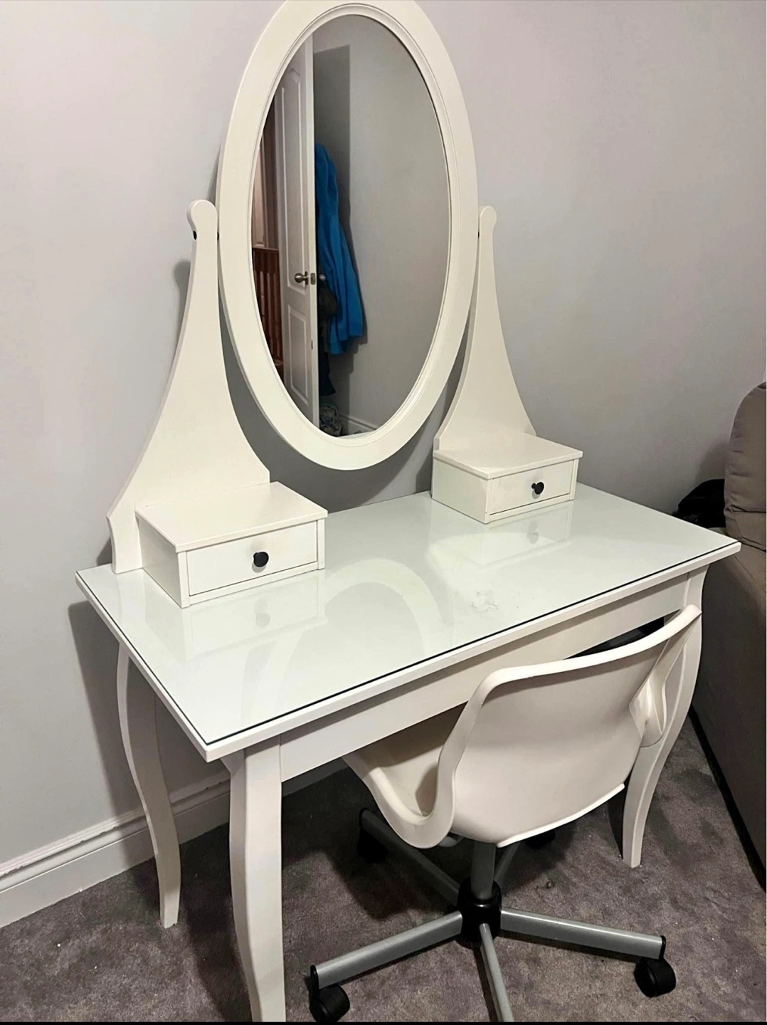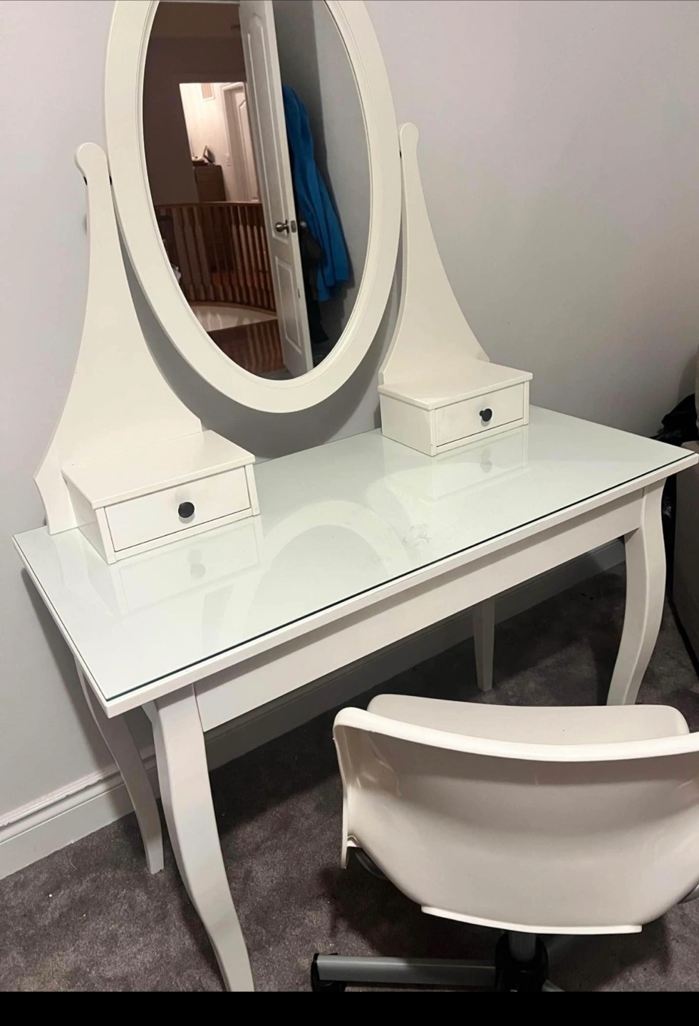 Selling a lovely white vanity table that comes with a mirror and a chair! It's in great condition and would be perfect for a bedroom or dressing area. The set includes the vanity table, an oval mirror, and a matching chair.