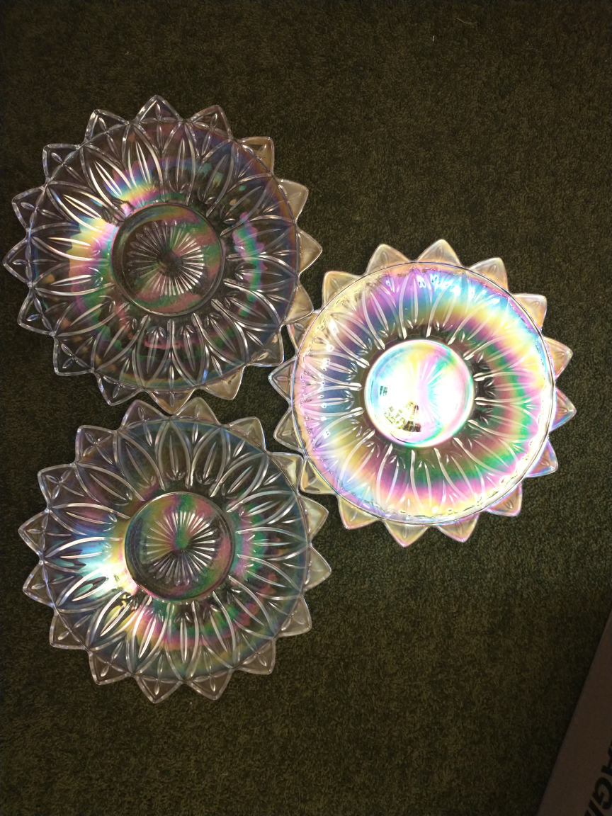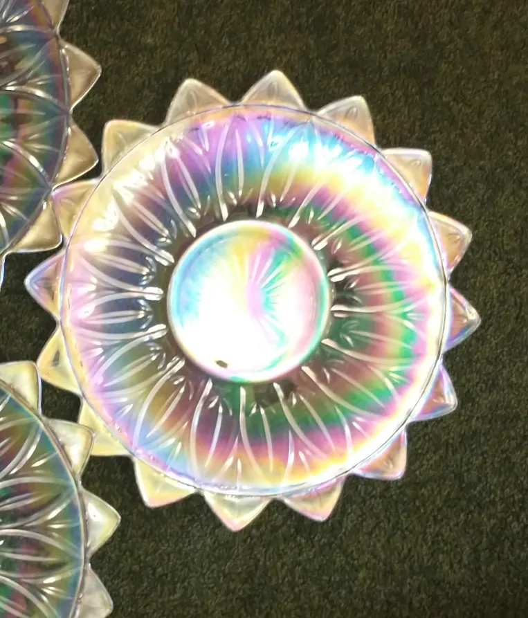 Selling a set of beautiful vintage iridescent sunflower glass plates. They have a beautiful rainbow sheen that catches the light nicely. Perfect for adding a touch of whimsy to your table setting!