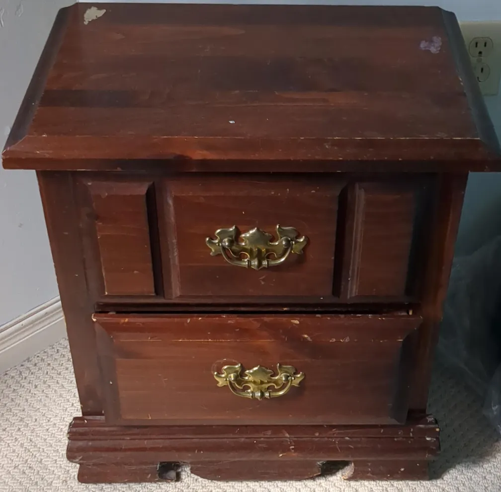Here's a wooden nightstand with two drawers. It has a classic design with brass-coloured handles. Shows some signs of wear and tear but still functional and sturdy! Perfect for a bedside table or small storage unit.