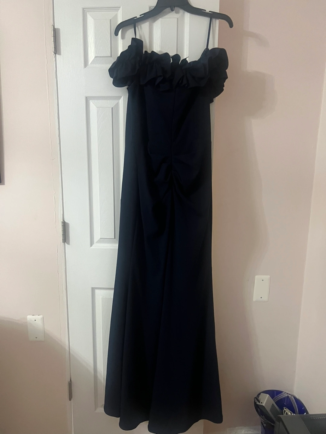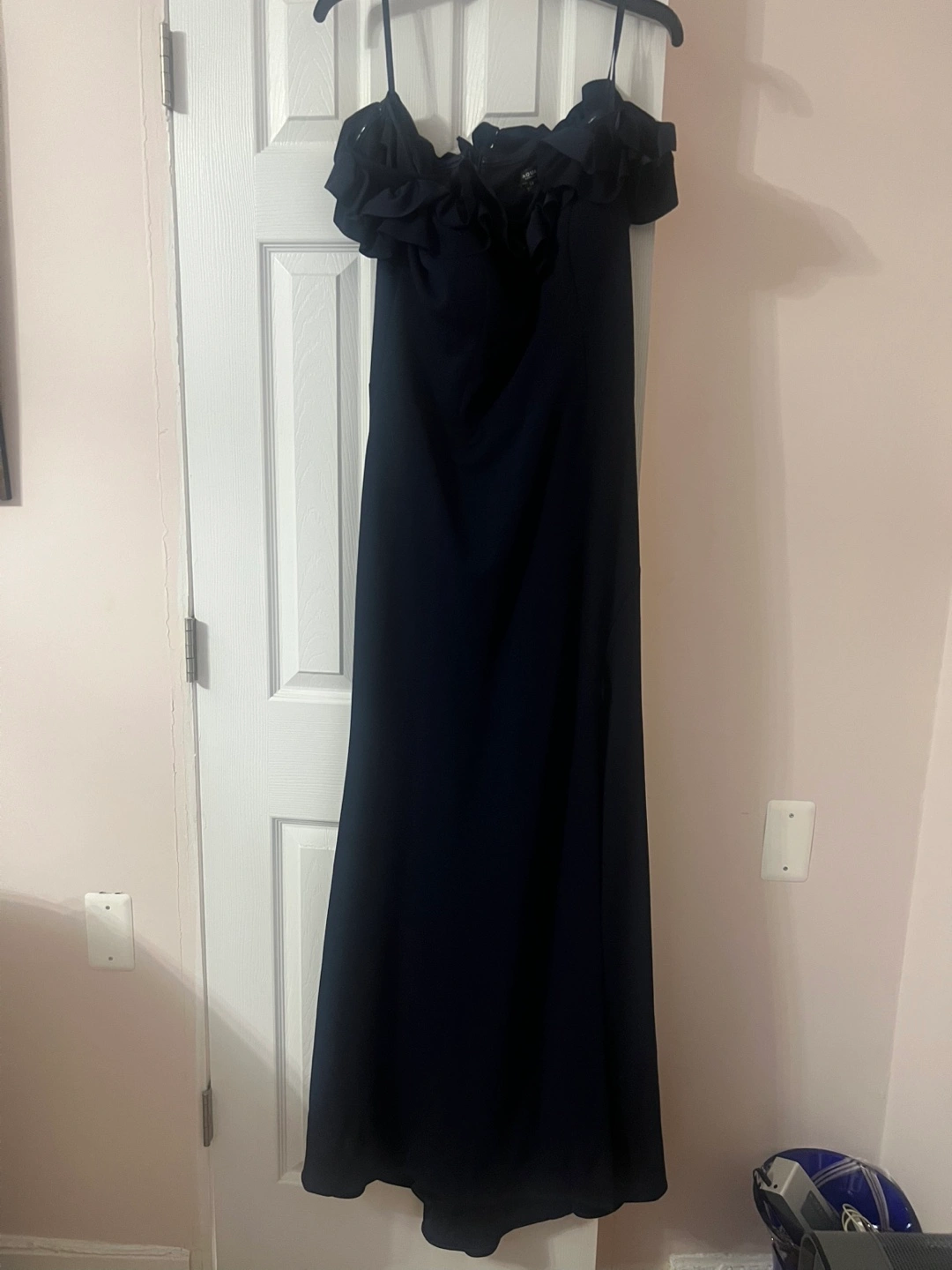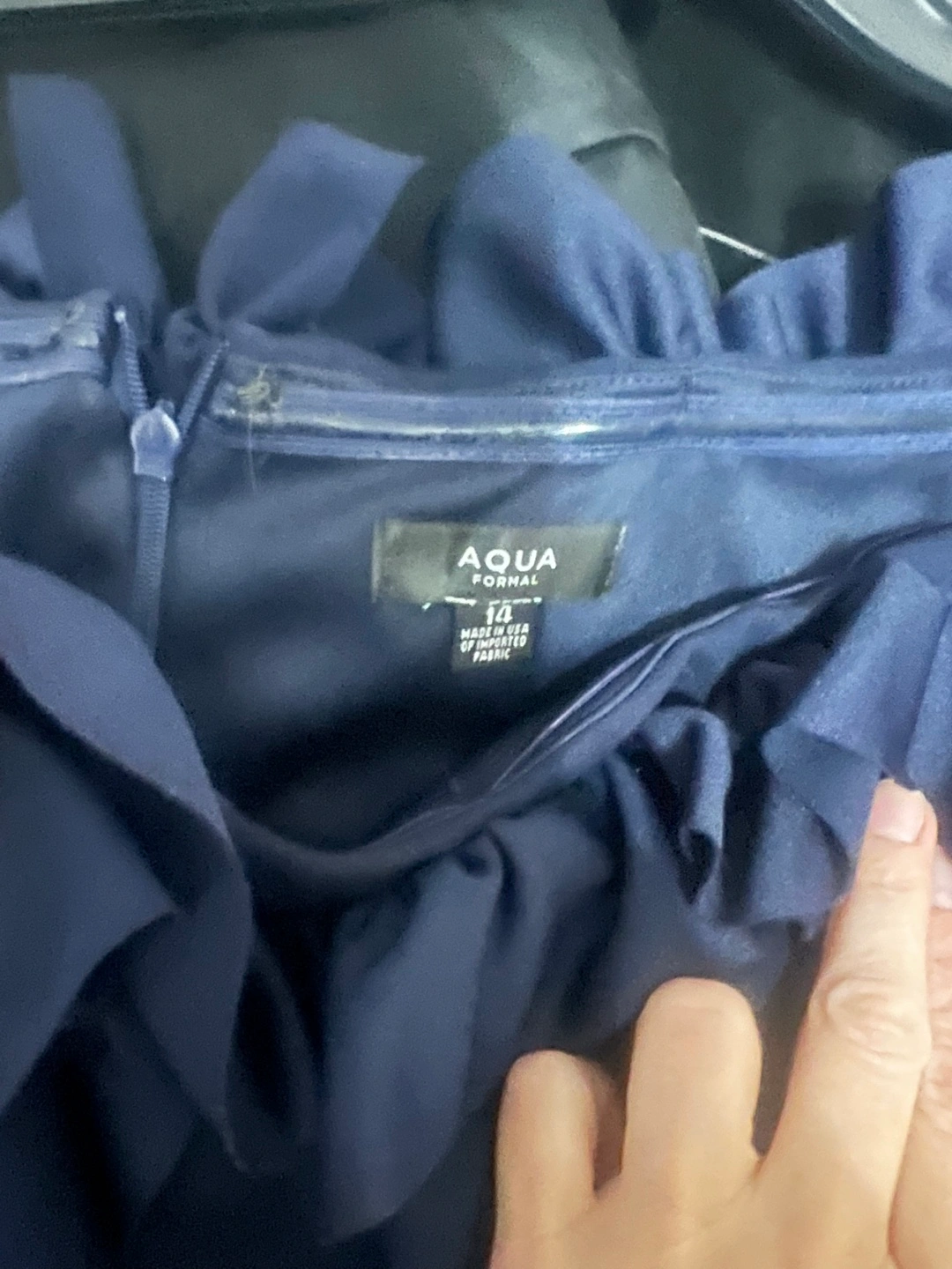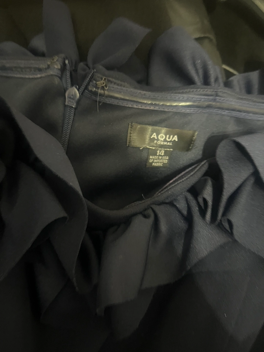 Selling a beautiful Aqua Formal dress in navy blue! It's a size 14 and features a lovely ruffled neckline and cinched back. Perfect for a special occasion!