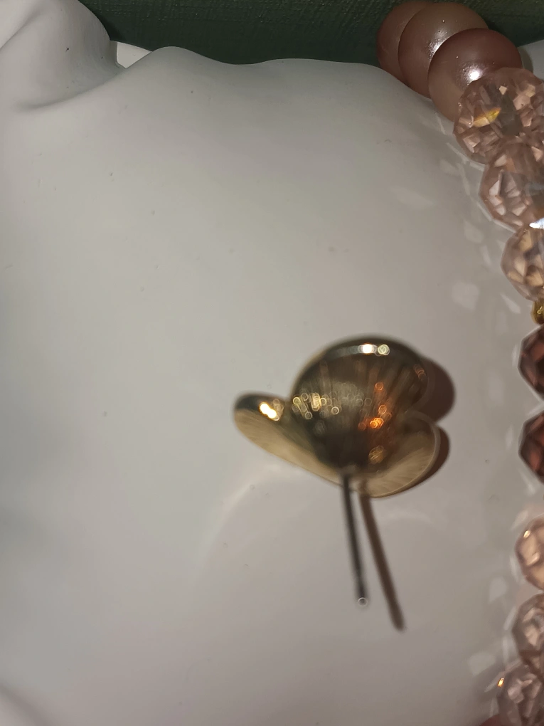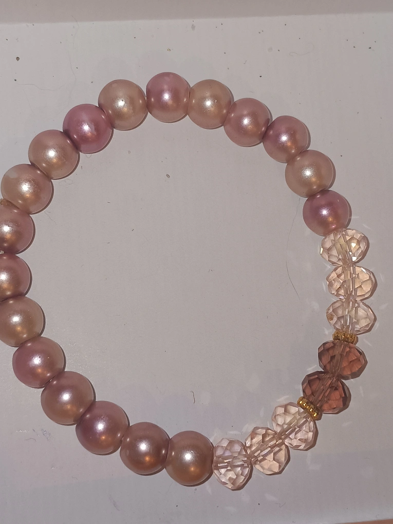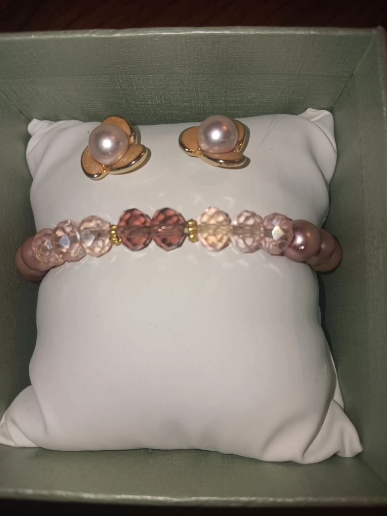 665This is a beautiful bracelet with pearl and crystal beads in shades of pink and rose. It comes with a pair of matching pearl earrings. It's the perfect set to add a touch of elegance to any outfit!