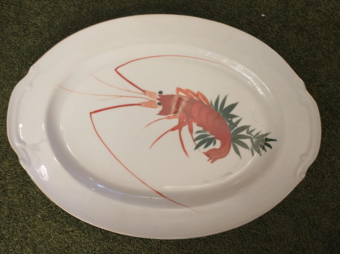 Selling a vintage platter featuring a lovely shrimp design! It's a great piece for serving or display. The platter is white with a detailed shrimp and foliage illustration in red and green. Perfect for adding a touch of vintage charm to your kitchen or dining room.
