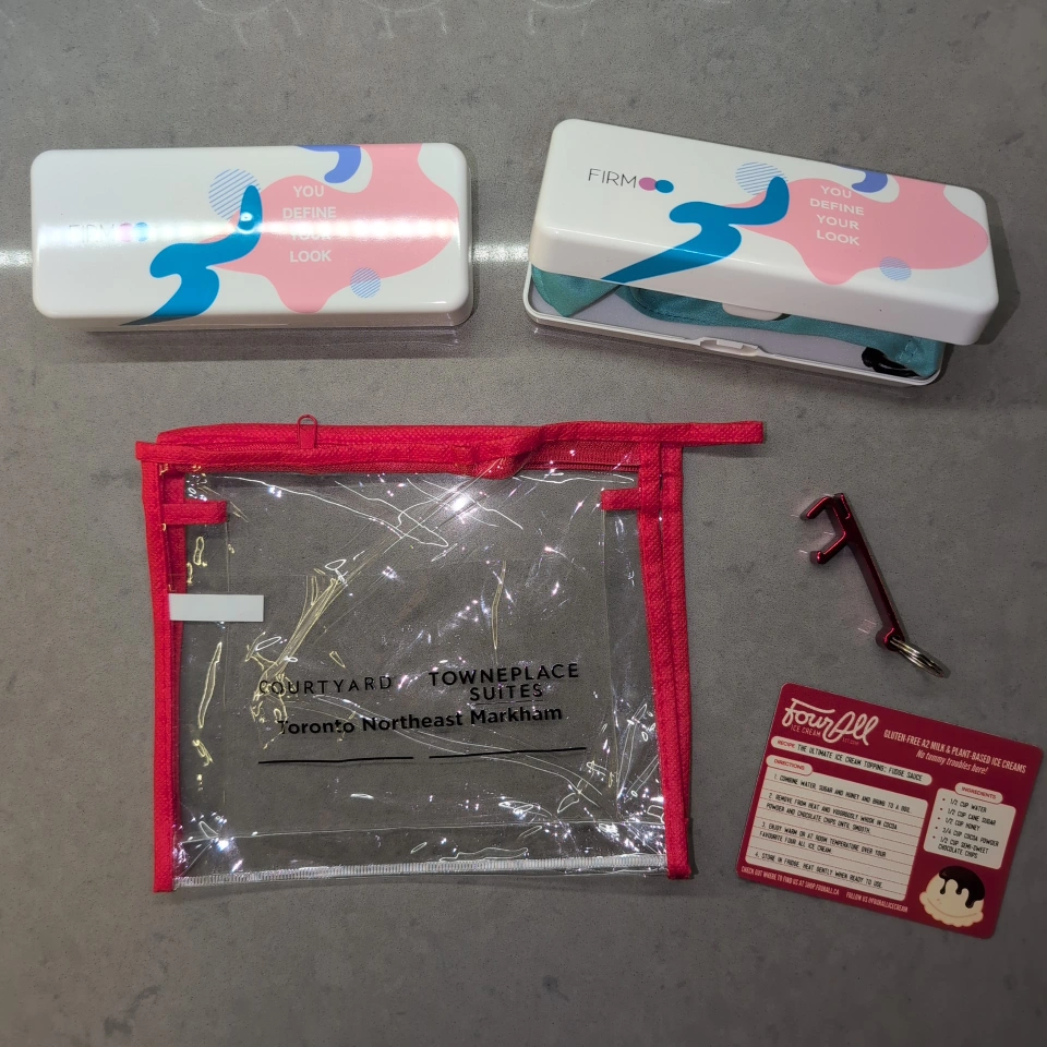 FREE miscellaneous items - 2 hard glasses cases - magnet with fudge sauce recipe - transparent toiletry bag - door opener keychain Pick up at Fort York and Bathurst