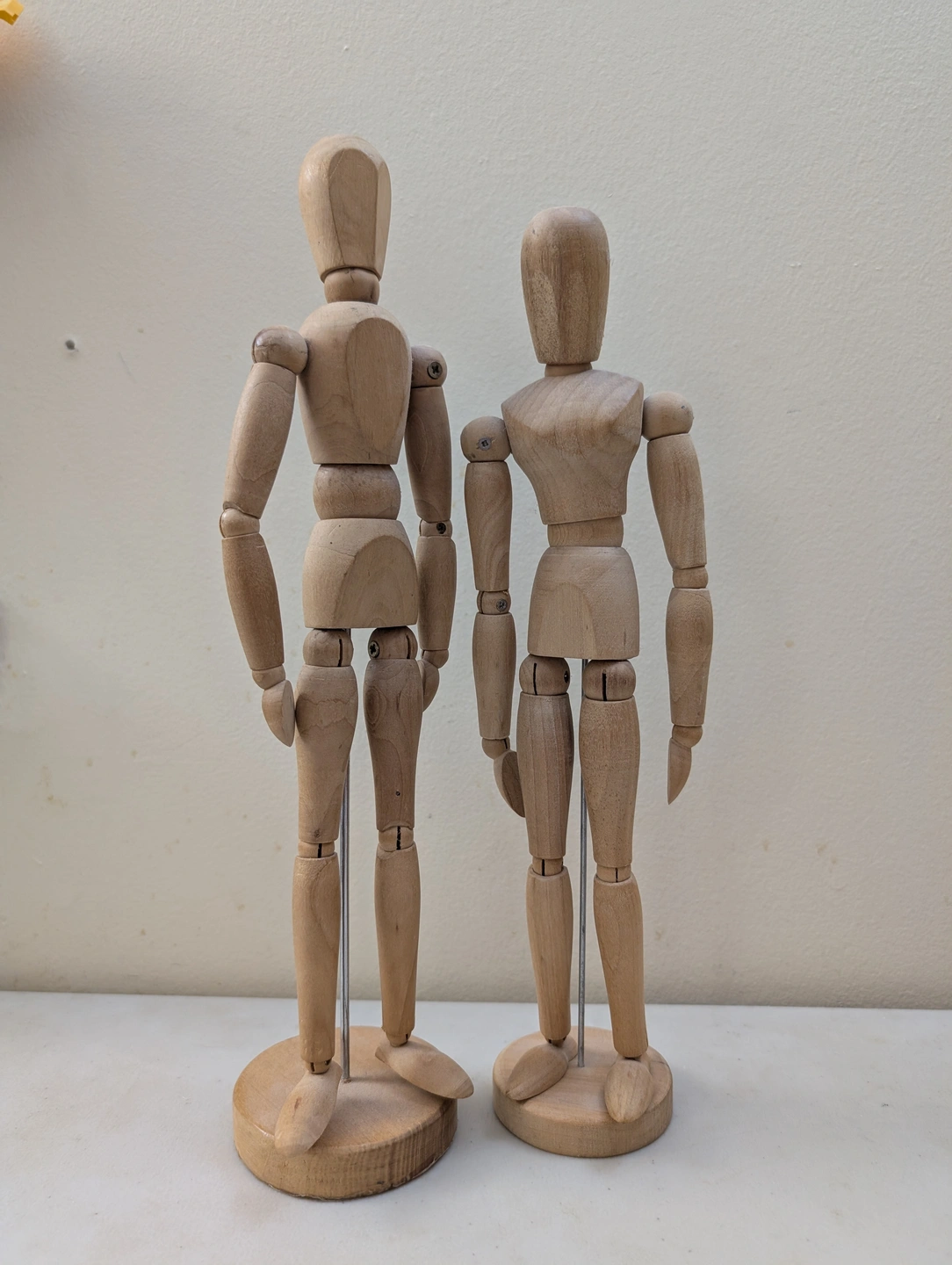 Selling two wooden artist’s mannequin figures – one male, one female. Great for drawing practice, art reference, or even as quirky desk decor.