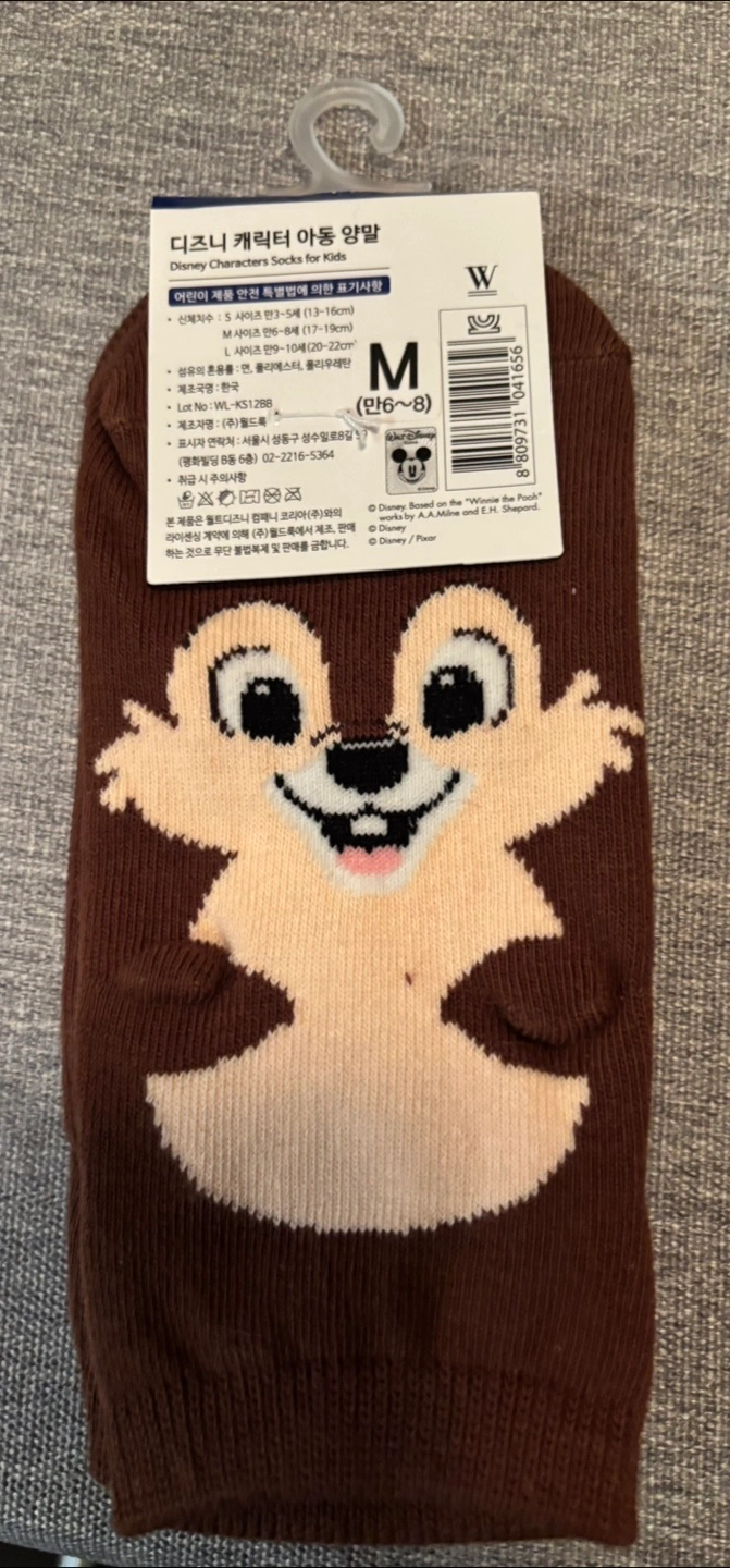 These adorable Disney character socks are perfect for your little one! They are size M (6-8) and feature a cute Chipmunk design. They're made from a blend of polyester and spandex, making them comfy and stretchy for all-day wear
