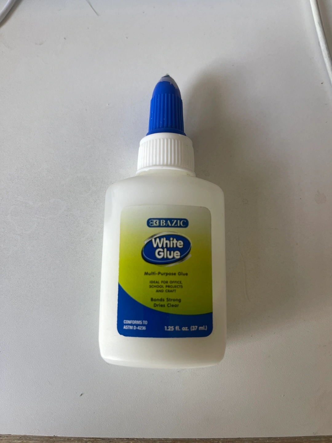 Selling a bottle of BAZIC White Glue! It's a multi-purpose glue, perfect for office, school projects, and crafts. It bonds strong and dries clear. The bottle contains 1.25 fl oz (37 ml).