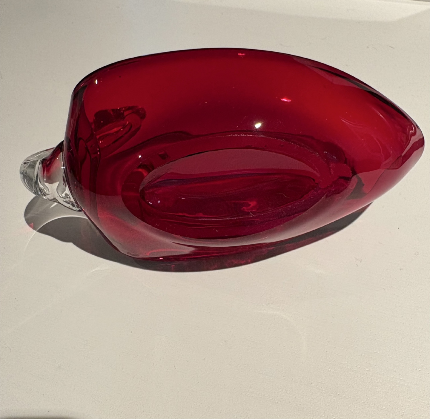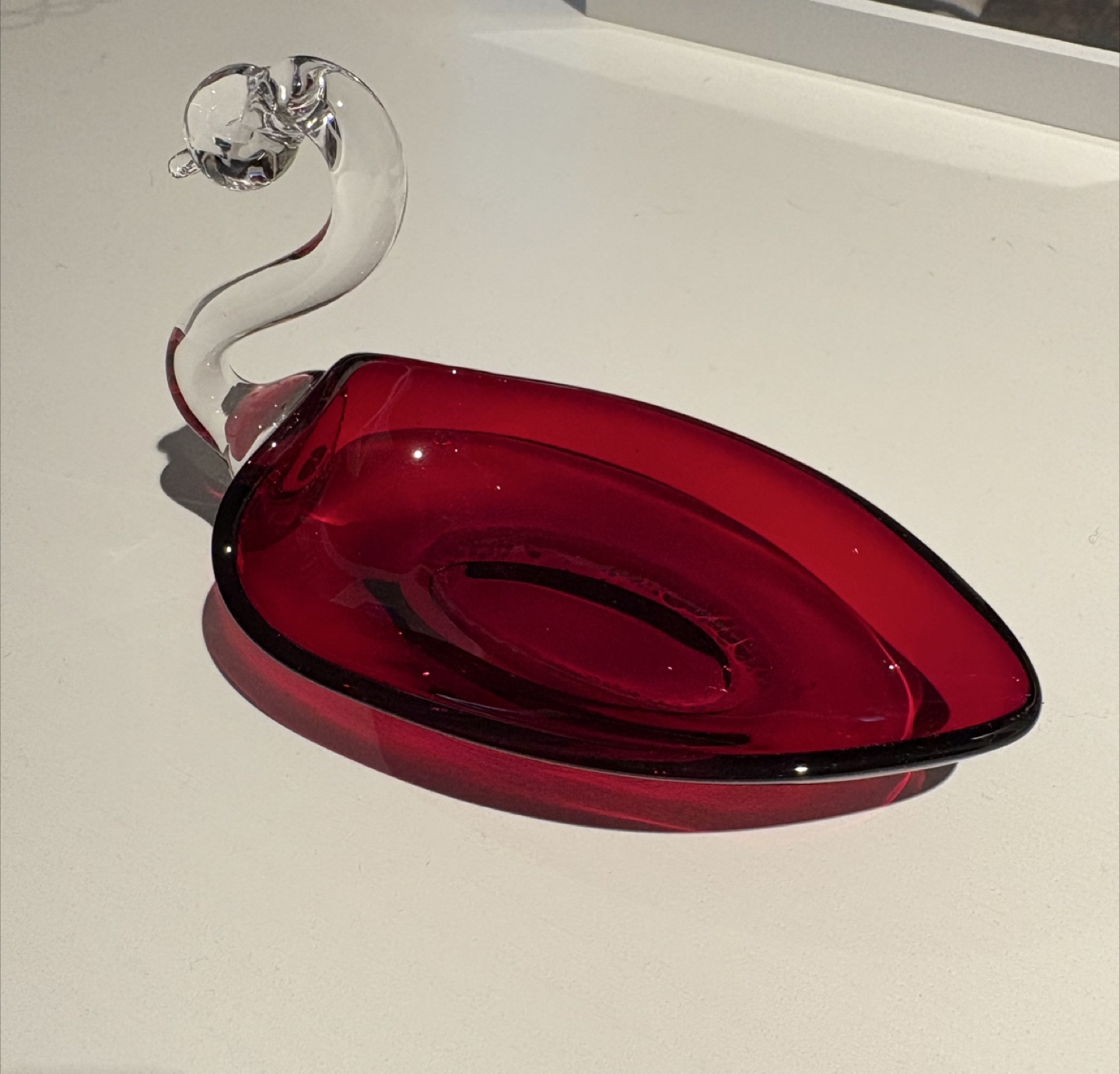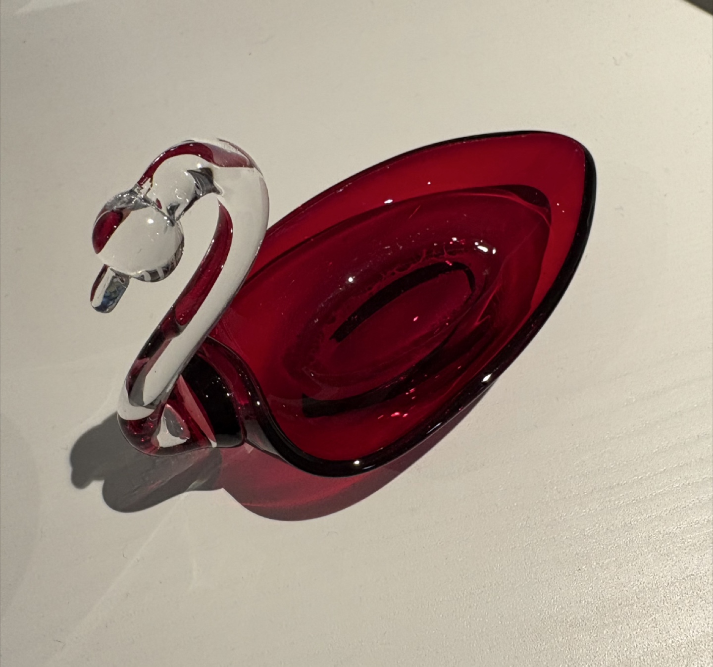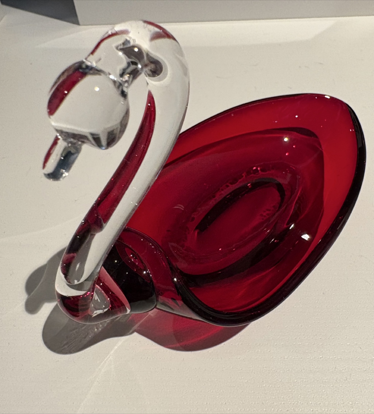 Here's a lovely red glass swan figurine that would look great as a decorative piece in your home! It has a clear glass neck and head, and a deep crimson red body.
