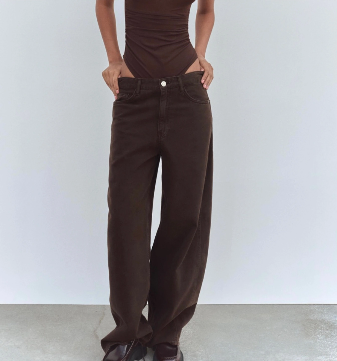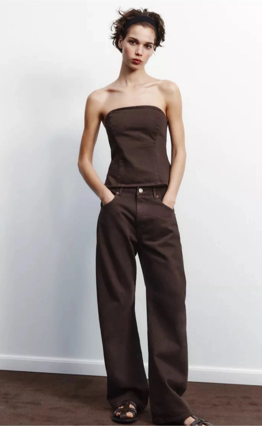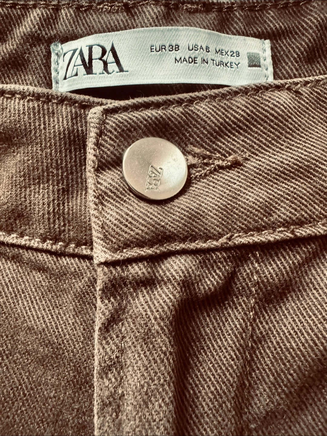 These are a pair of Zara wide leg jeans in a nice brown color. The size is a US 6, which is equivalent to a EUR 38 and MEX 28. They're made in Turkey and have a stylish, relaxed fit. Perfect for a casual look!