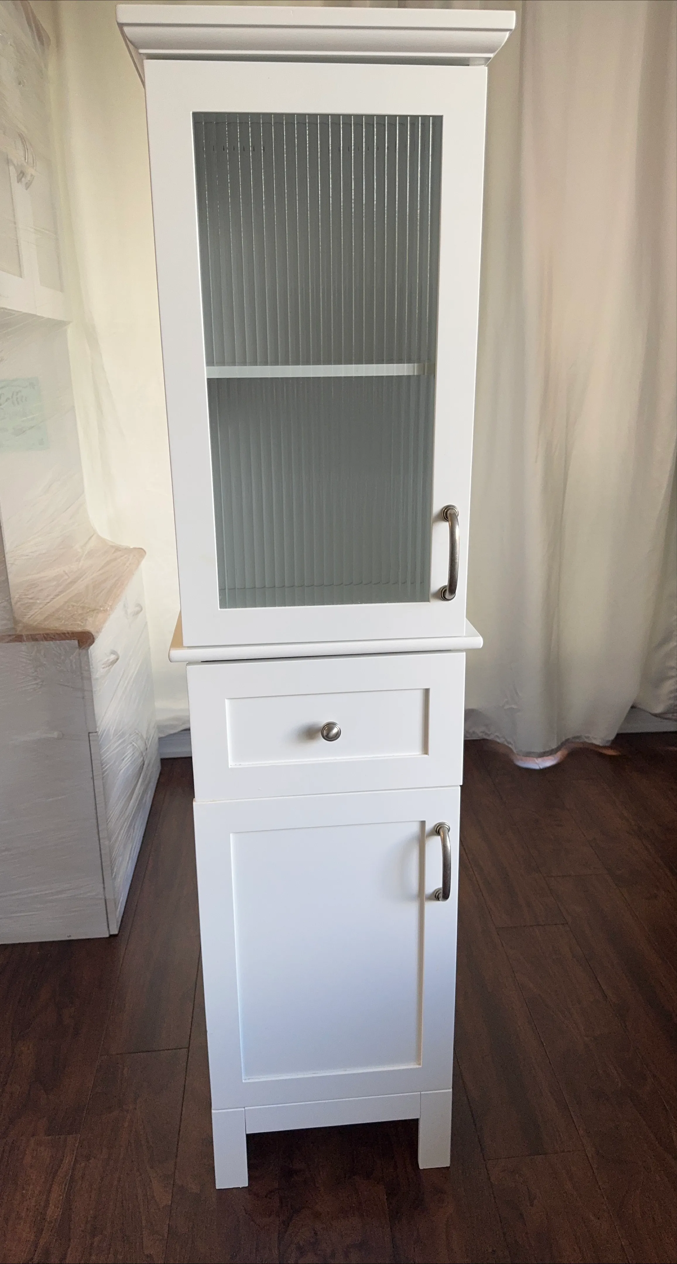 Here's a lovely white bathroom cabinet! It features a glass door on top and a drawer and cabinet below for extra storage. It's in great shape and would be a wonderful addition to any bathroom