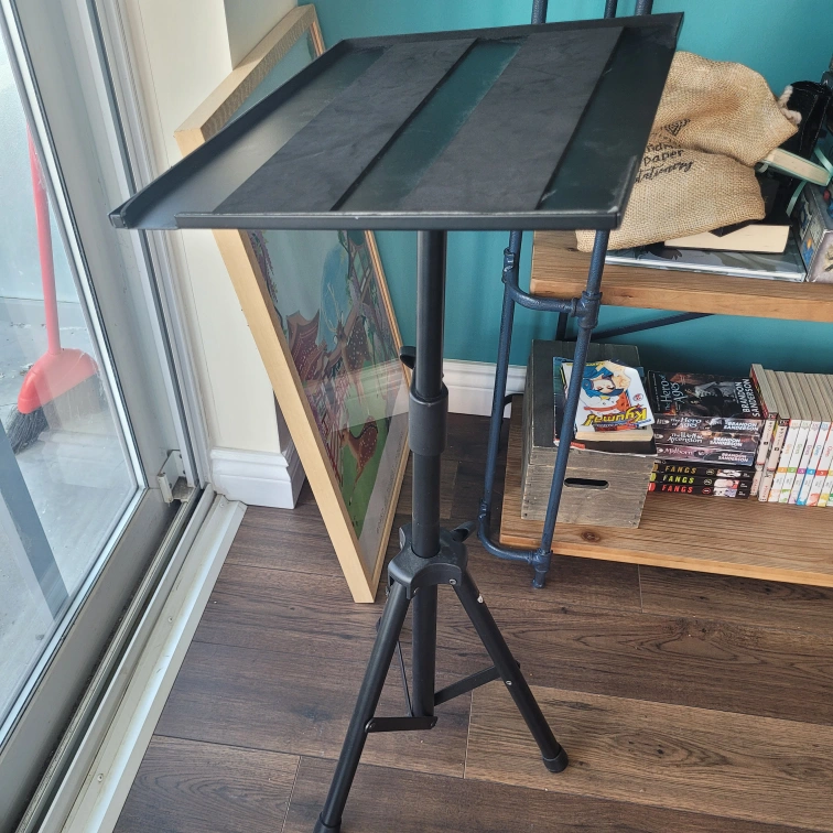 This is a black adjustable projector stand/sheet music stand with a tripod base. It's in great shape - was initially purchased for around 80 dollars.