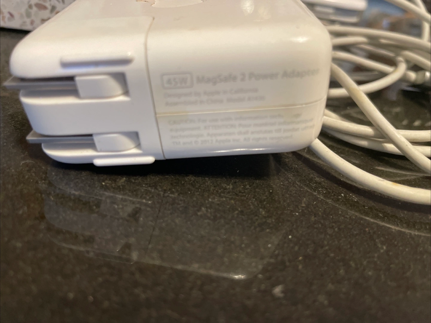 Selling an Apple 45W MagSafe 2 Power Adapter. It is designed by Apple in California and assembled in China. Model A1436. There is a small damage to the cord.