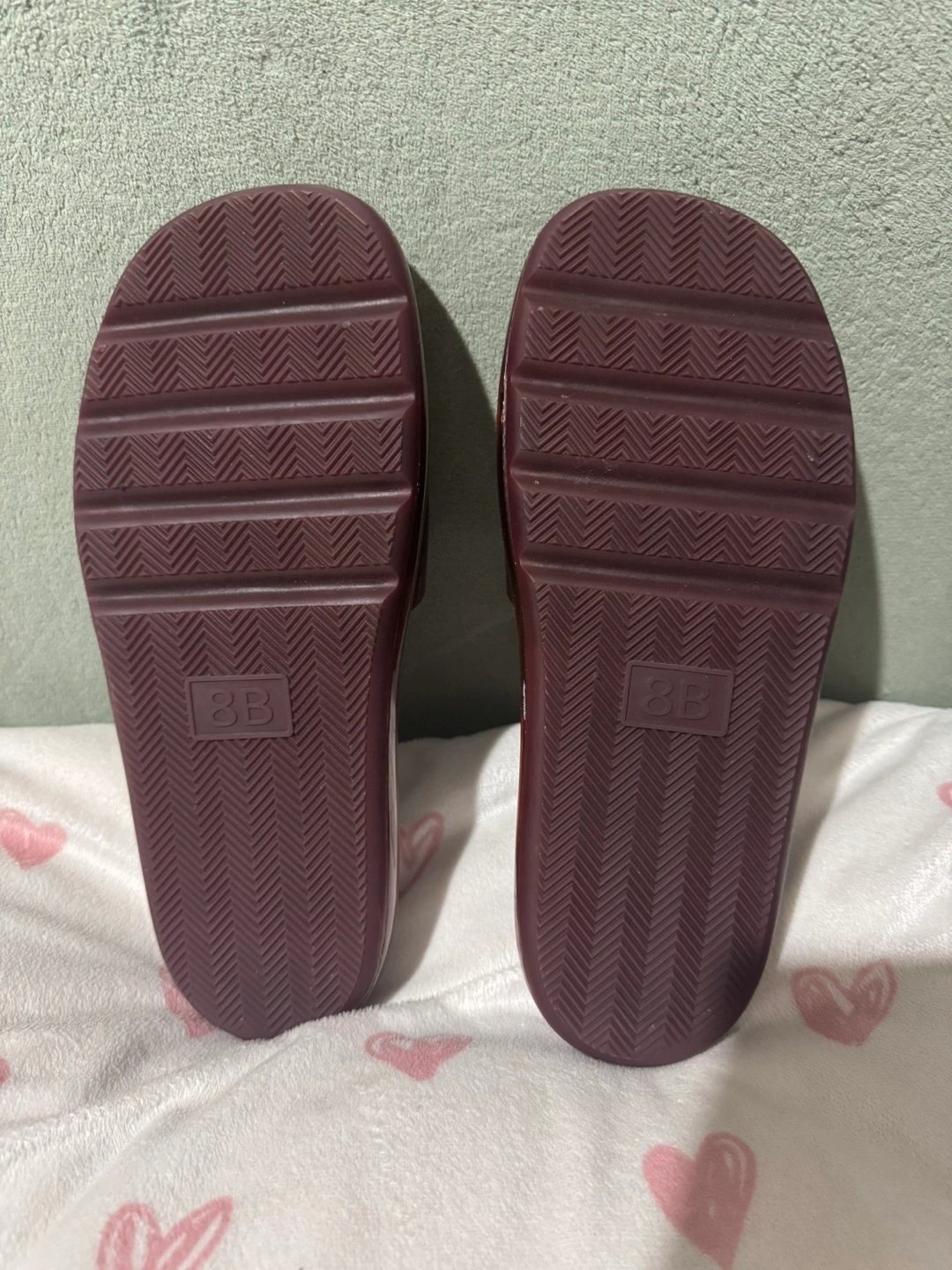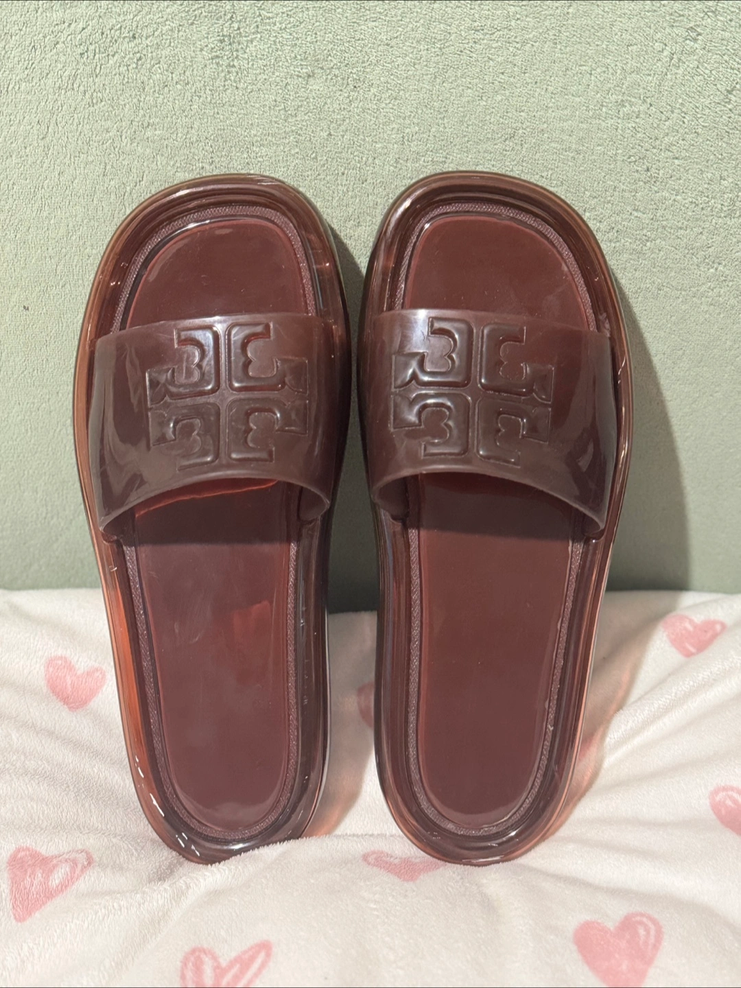 Tory Burch Women's Bubble Jelly Slide Sandals, size 8. These sandals have been worn indoors only and have some white marks. The color is in between maroon and brown.