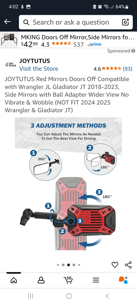 JOYTUTUS Red Mirrors Doors Off Compatible with Wrangler JL Gladiator JT 2018-2023. The mirrors have a ball adapter, wider view, and no vibrate or wobble. The mirror can be rotated up and down 360°. The mirror can be adjusted front and back 230°.