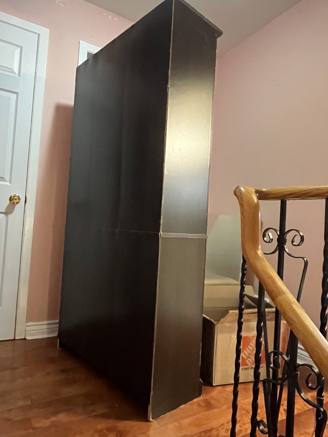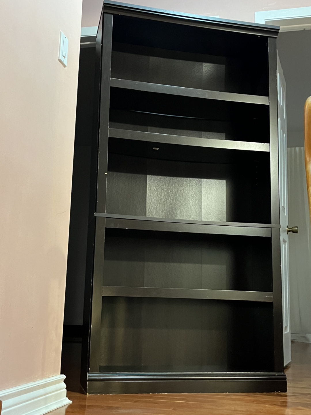 Selling a tall black bookcase. It has multiple shelves for storage and display. Perfect for organizing books, decor, or other items in your home. It's in fair condition (some scratches…) and ready for a new home