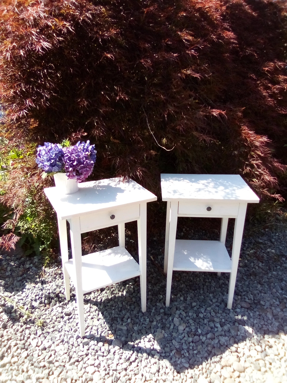 Selling a set of two charming Ikea white wooden bedside tables. These tables feature a drawer and a lower shelf, perfect for storing your nighttime essentials. Recently touched up, priced to sell. Moving