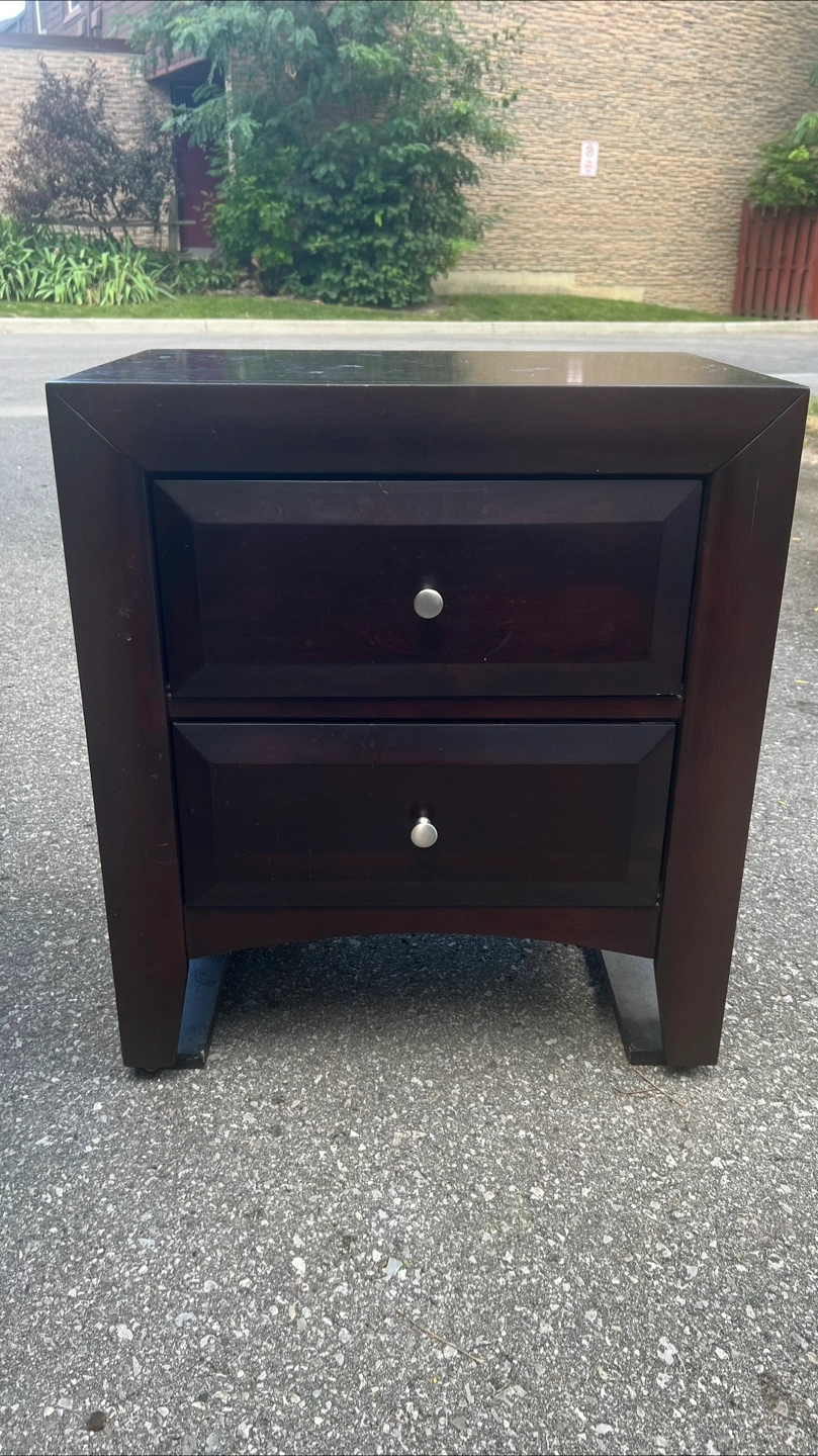 Selling a dark brown nightstand with two drawers. It has some wear and tear on the top surface, but the drawers are in good working condition. Great for adding some storage next to your bed!