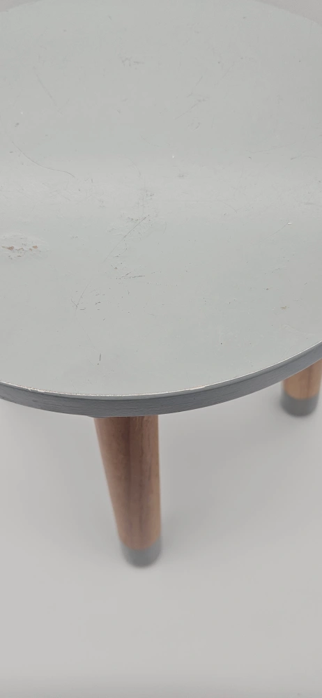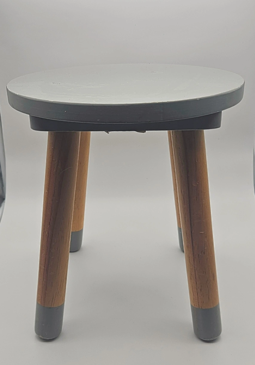 Here's a cute little step stool! It's got a grey top and wooden legs with grey accents. It's perfect for a new home, just needs a bit love