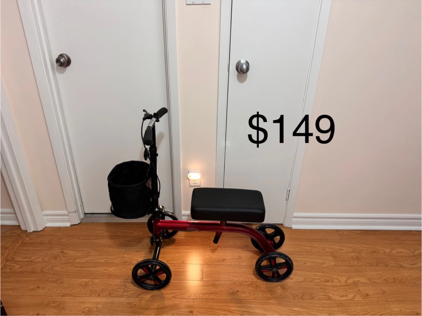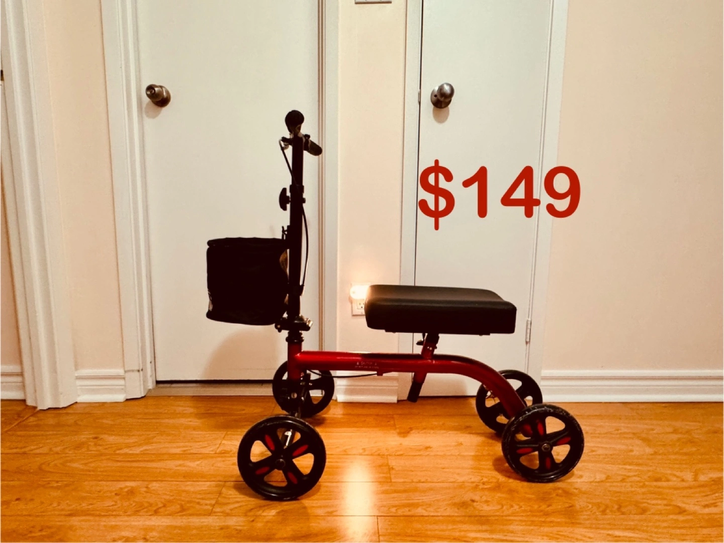 Used (only one week at home),(like new) knee scooter. Features a padded knee rest, basket, and adjustable handlebars. Four wheels for smooth mobility. Excellent condition.