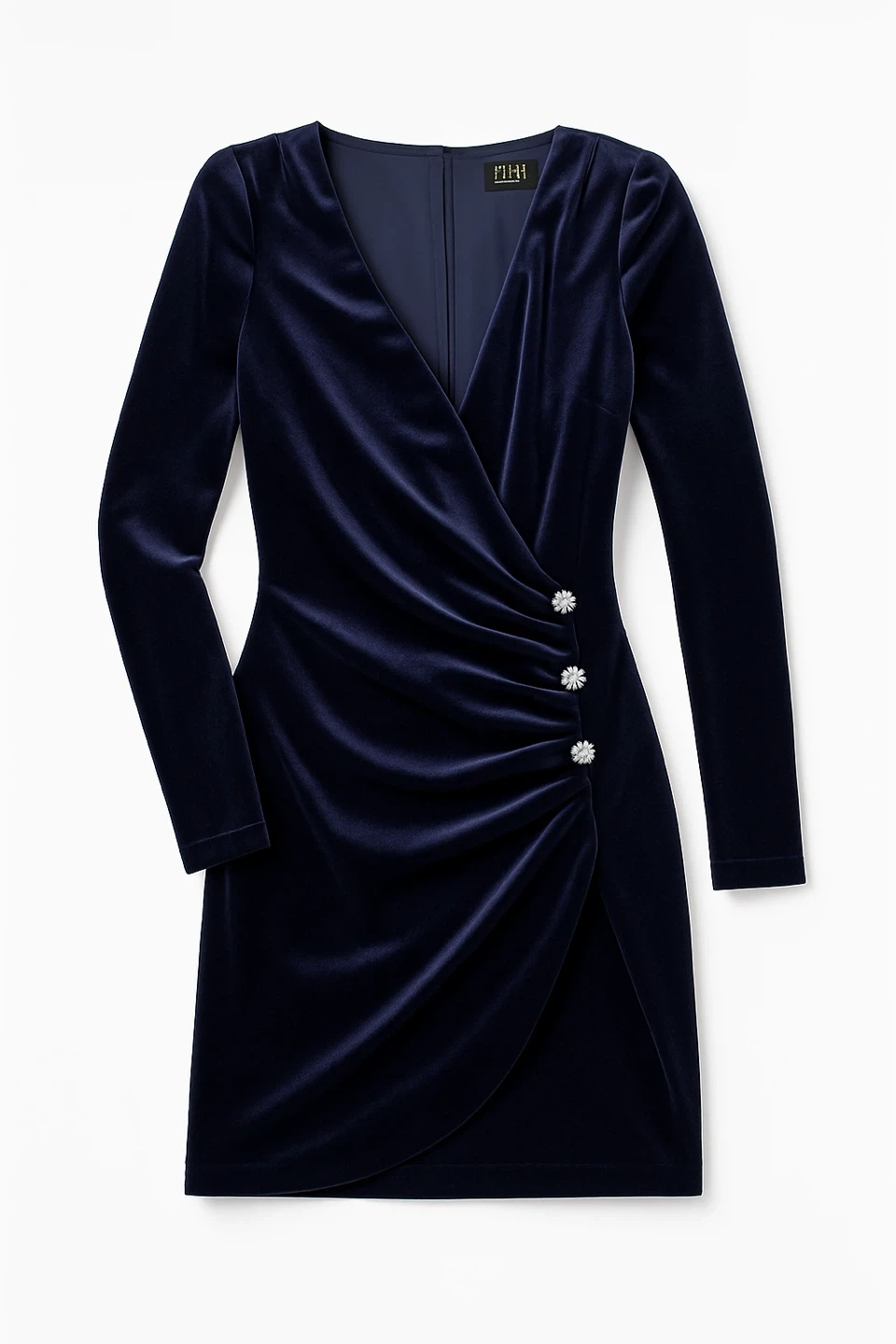 This is a beautiful velvet mini dress . It's a gorgeous navy blue colour, perfect for a night out or special occasion. The dress features a flattering wrap style with long sleeves and decorative buttons