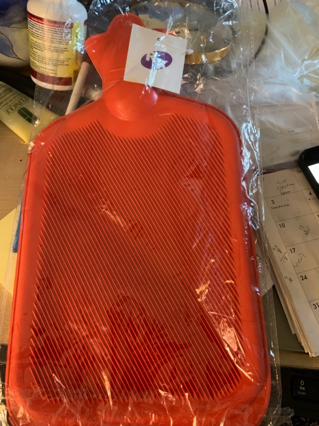 Here's an orange hot water bottle, still in its original packaging! It's perfect for those chilly nights or soothing sore muscles. It is in new condition and ready to use