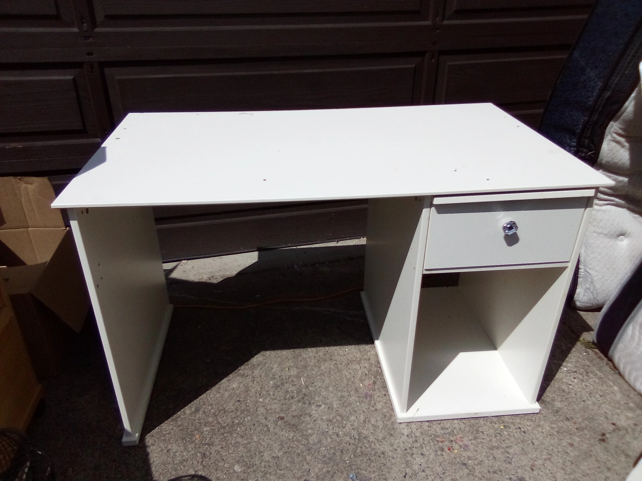 Selling a simple white desk, perfect for craft projects or student. It has a single drawer with a decorative knob, offering a bit of storage. The desk is in good condition and ready for a new home!