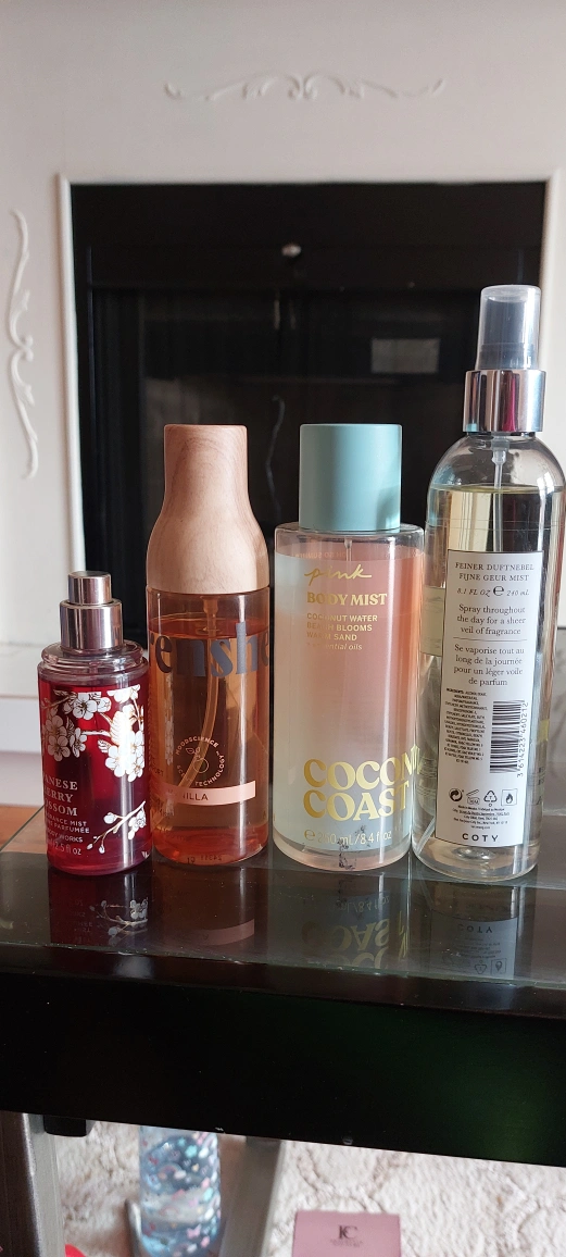 Selling a few body mists! There's a Pink Coconut Coast body mist , a Japanese Cherry Blossom fragrance mist , and a Coty fine fragrance mist .
