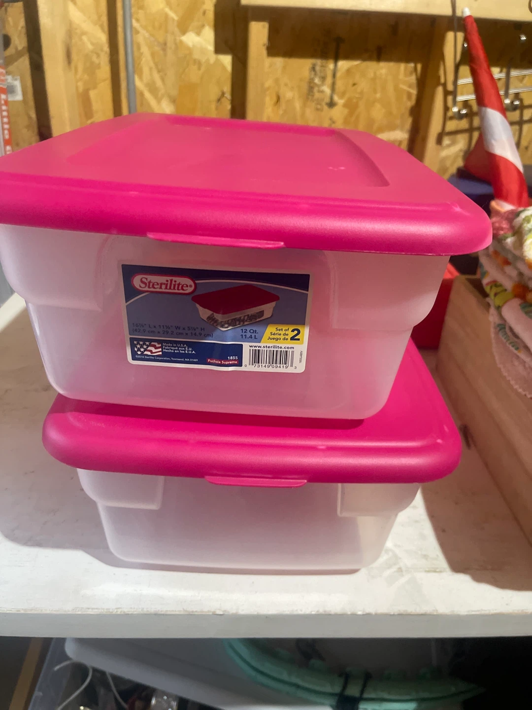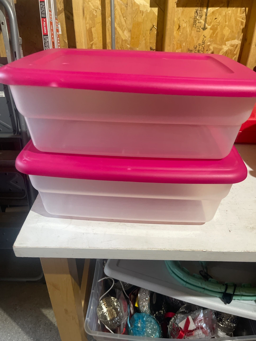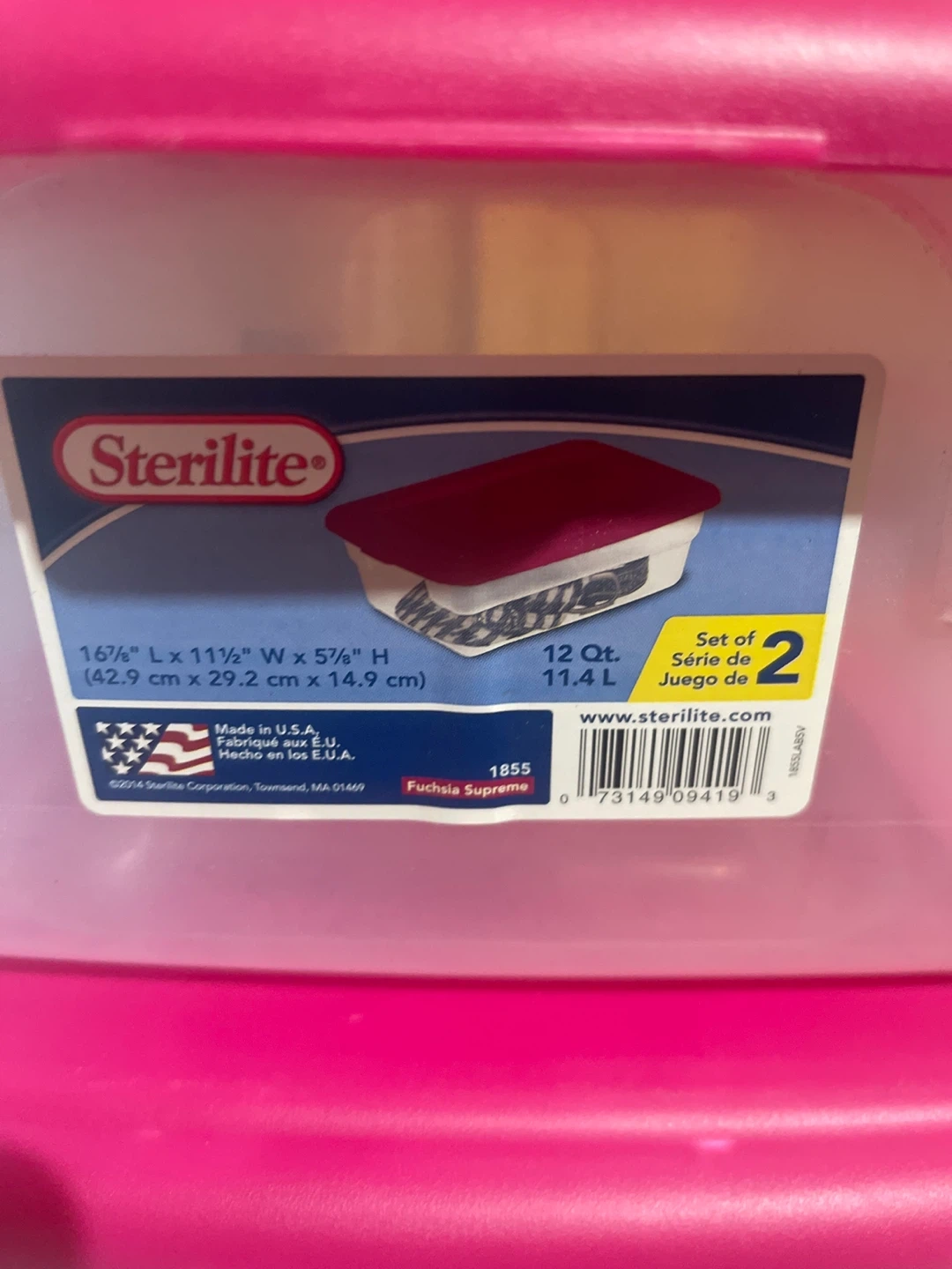 Selling a set of two Sterilite storage containers in Fuchsia Supreme! Each container has a 12 Qt / 11.4 L capacity. The dimensions are 16 7/8" L x 11 1/2" W x 5 7/8" H (42.9 cm x 29.2 cm x 14.9 cm)