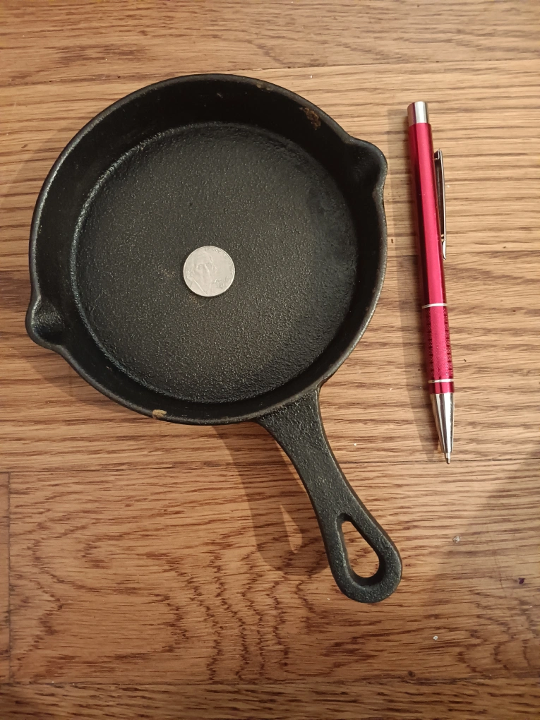 665Selling a small cast iron skillet. It shows some signs of use, but is still in good condition for cooking. Perfect for single servings or small side dishes!