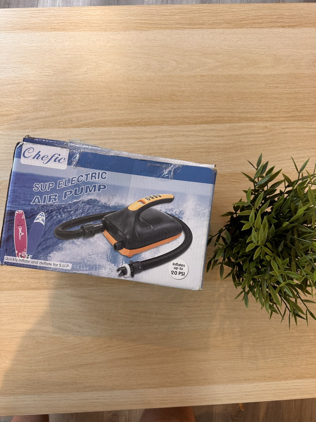Selling a Chefic SUP electric air pump. It quickly inflates and deflates for SUP. It can inflate up to 20 PSI. The box is included!