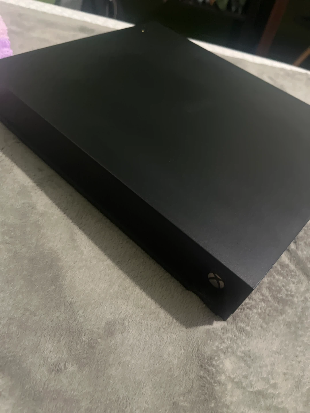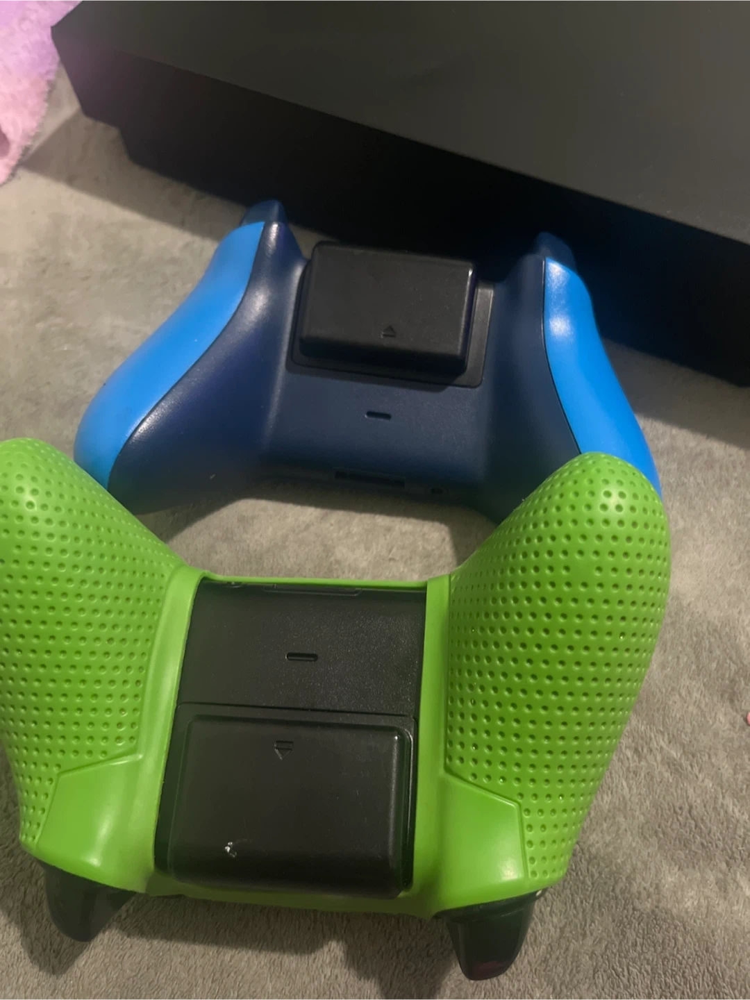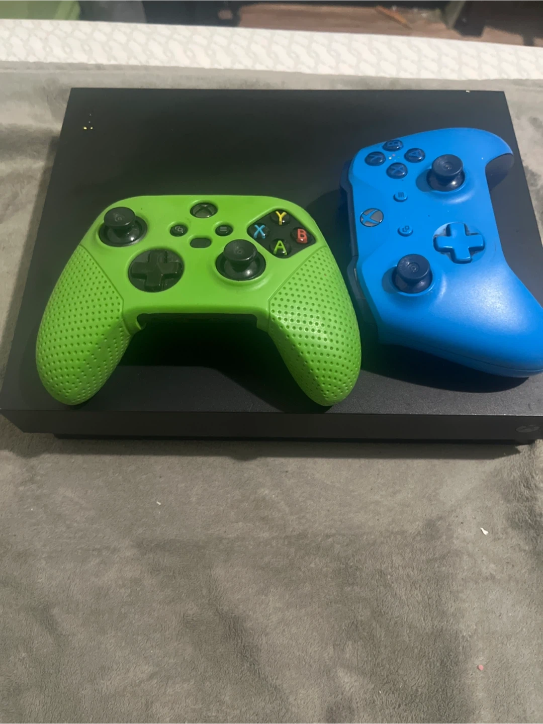 Used Xbox one with two controllers with grip covers ( missing the joystick grip but otherwise fine ). Blue controller has some sharpie on it comes with rechargeable batteries