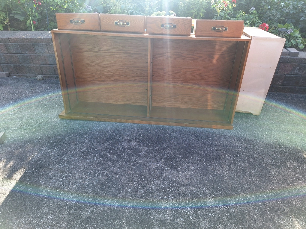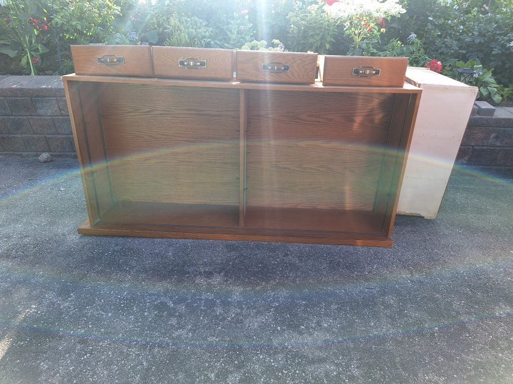 Selling a used entire wall cabinet set. It's made of solid oak wood and includes doors and shelves. It's in good condition and ready for a new home!